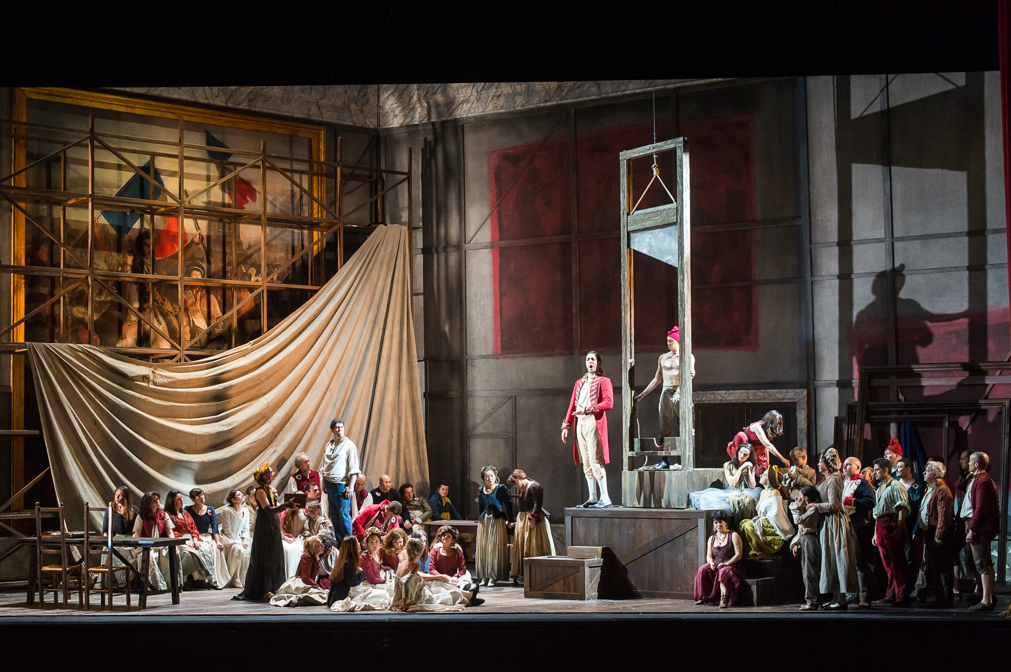 Mettere in scena il mastodontico Andrea Chénier di Giordano non è impresa facile, innanzitutto nel pensare ad una regia credibile che non sappia di muffa, ma soprattutto, fatto di grande importanza, trovare interpreti che non facciano rimpiangere ciò che molti hanno ancora nelle orecchie dai fasti dei decenni passati. Lo sforzo produttivo dei teatri dell’ Emilia Romagna in coproduzione con Opéra de Toulon è certo notevole e deve averci pensato anche il regista Nicola Berloffa quando si è trovato a dover affrontare un capolavoro del genere. Come fare sognare il pubblico senza farlo annoiare? Come portare su palcoscenici non chilometrici il dramma della Rivoluzione francese e muovere masse artistiche in modo sensato evitando l’effetto claustrofobia? Il regista ha cercato di rispondere a queste esigenze con un insieme di idee che volgono verso la tradizione ma riuscendoci solo in parte. Riprendendo lo schema geometrico molto in voga attualmente la struttura di Justin Arienti ove si svolge l’azione è angolare e si trasforma cambiando colori o svelando particolari di volta in volta. Il castello di Coigny vede troneggiare nella sala principale un arazzo che riprende il celebre dipinto di Maria Antonietta e prole di Élisabeth Vigée Le Brun posto alla Reggia di Versailles, una onnipresente ghigliottina simboleggia il dramma storico in atto con un ovvio sbandieramento di tricolori francesi da parte del popolo in rivolta; inoltre impalcature, dipinti rivoluzionari e una serie di elementi ‘arricchiscono’ di volta in volta le scene. Questa serie di proposte forniscono la cornice ad una regia abbastanza statica, che ruota principalmente intorno alla ghigliottina e dove la folla di comparse e mimi non ha sempre una collocazione agevole, proprio per mancanza di spazio che forse poteva essere studiato diversamente. In stile i costumi di Edoardo Russo.