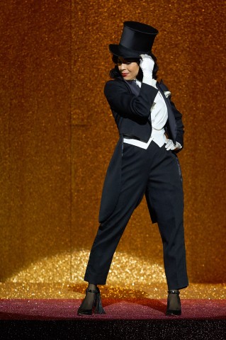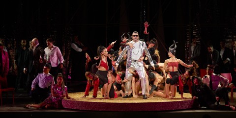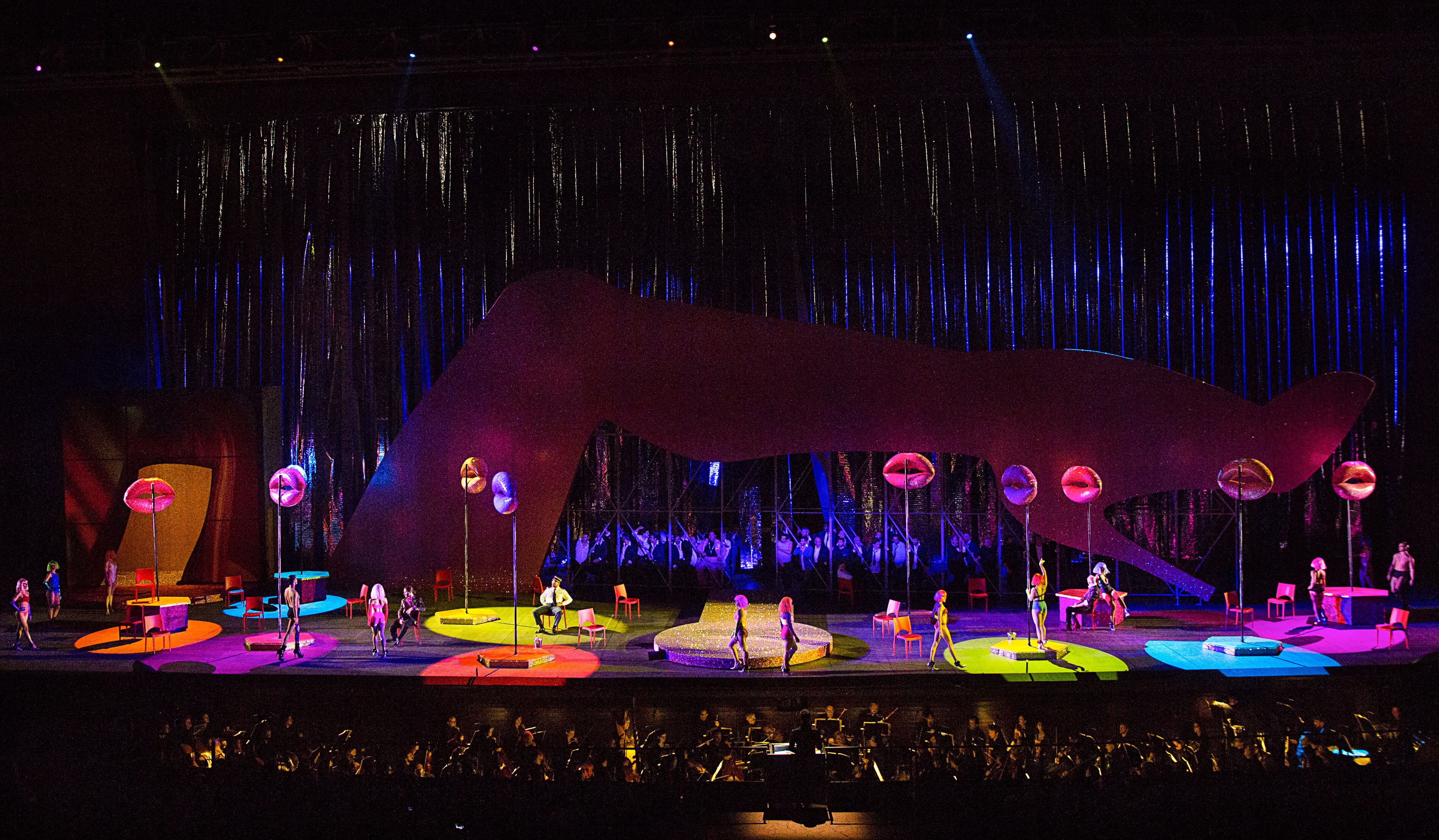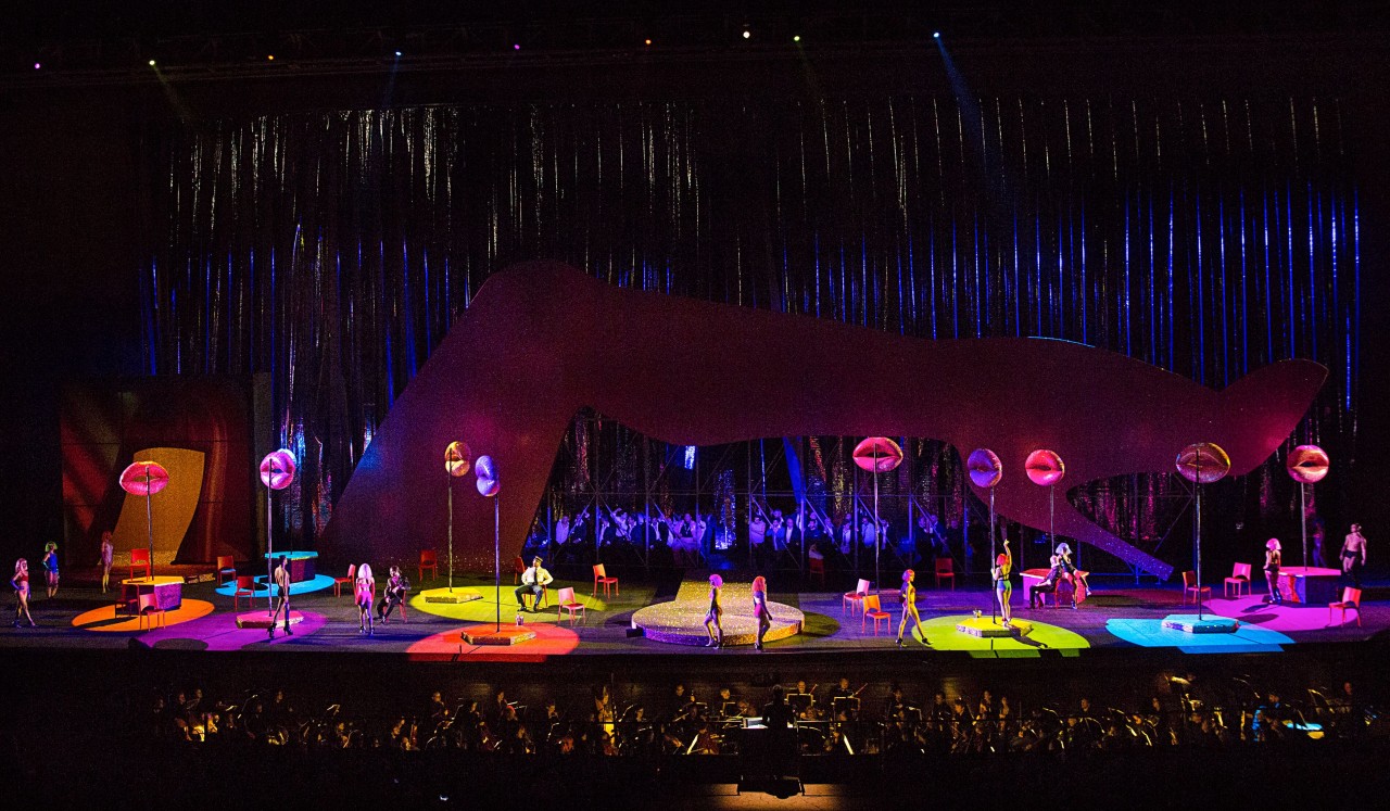 Chiaro che le concessioni al libretto sono state notevoli, ma non viene meno il filo conduttore che vede in ogni caso Carmen al centro del triangolo amoroso e mortale con Don José ed Escamillo. Però qui la zingara è una provocante ma ribelle prima donna da cabaret, che tanto per cominciare appare in scena sì per spogliarsi e fare i suo numero, ma in abiti maschili, volitiva e un po’ selvaggia. Il corpo di ballo che la circonda è abbigliato proprio con acconciature e ‘mise’ tipiche del cabaret francese, così come le scenografie di Mauro Tinti, che firma anche tutti i costumi, sono un forte richiamo al locale parigino; su tutto l’enorme profilo di gamba femminile con tacco vertiginoso che impera a sfondo del locale. La storia dei tre amanti diviene anche argomento da rotocalco, tanto che il quarto atto è qui una serata di gala in stile Notte degli Oscar, in cui i flash dei paparazzi accecano un già inferocito Josè, che di fronte alla volubilità di Carmen, presentatasi come una diva a fianco del nuovo compagno Escamillo osannato dalle folle, perde il senno e la colpisce con violenza inaudita con una fotocamera rubata ad un reporter, lasciando attoniti la presentatrice silente, i finti giornalisti ammassati dietro le corde di sicurezza, e naturalmente il pubblico reale. Oltre a ciò la regia ha previsto delle esibizioni funamboliche sugli immensi muri dello Sferisterio, da parte di abili professionisti, per riempire gli spazi prettamente musicali o probabilmente per accompagnare le azioni più deboli. Forse questa è la parte dello spettacolo che si potrebbe anche omettere, ma anche in questo caso il regista si è ispirato a ciò che avviene effettivamente in spettacoli francesi. A tal proposito il corpo di ballo si cimenta in coreografie affatto scontate ed anzi particolarmente impegnative, ideate da Johnny Autin, che lo impegna tanto fisicamente quanto, a nostro avviso, emotivamente. Dunque tutto è ben pensato, sviluppato e realizzato, il resto è soltanto una questione di gusto e preferenze.