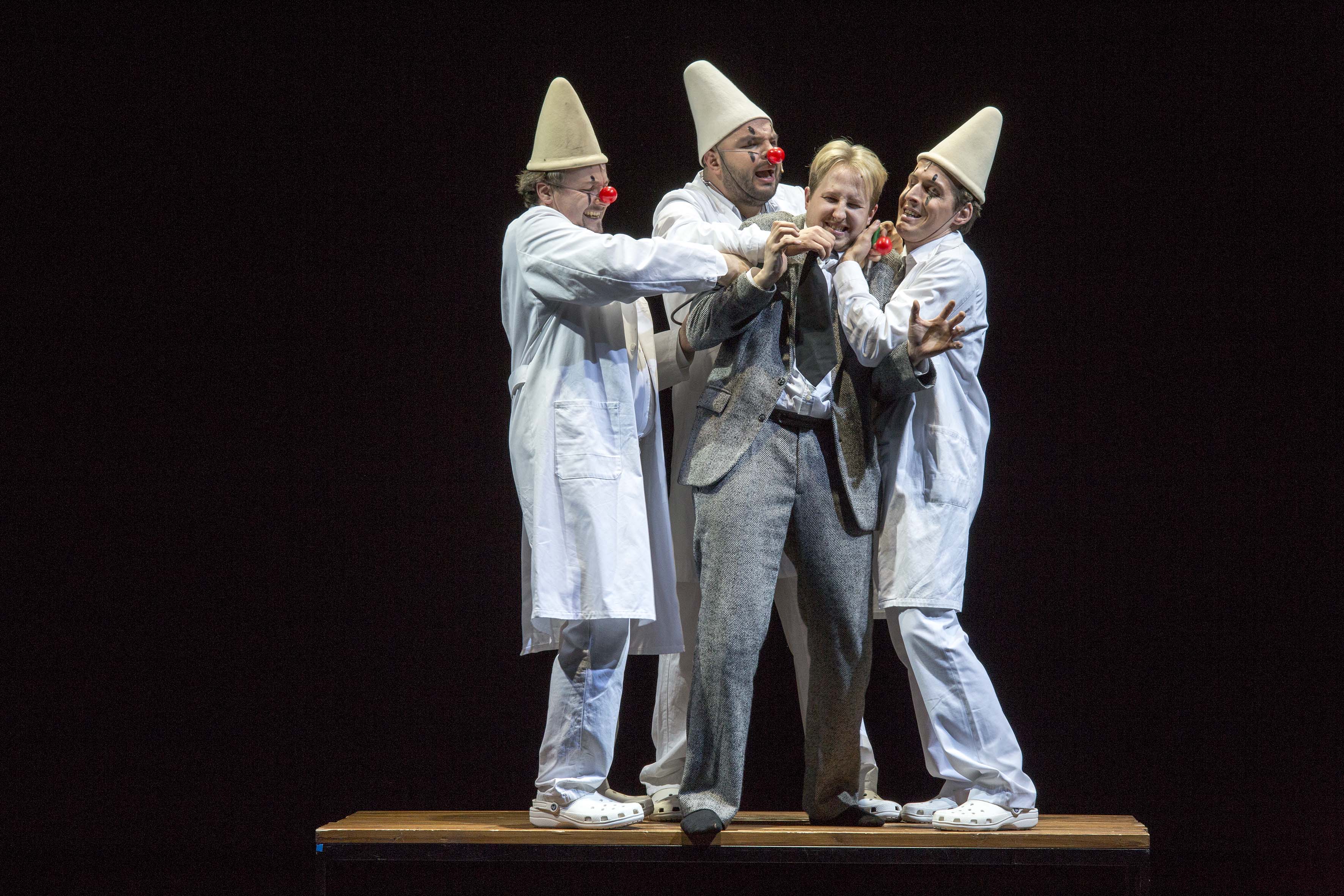 Tra gli interpreti spicca chiaramente il ruolo di Victor, Wolfgang Resch, cui non deve essere stato facile imparare un linguaggio artificioso e per nulla assimilabile a qualcosa di noto comunemente. Ma in generale abbiamo apprezzato tutta la compagnia di canto, che si è districata tra più di un ruolo ed utilizzando la voce al meglio delle sue possibilità, ciascun interprete nel proprio registro. Ricordiamo dunque Elisabeth Breuer, anch’essa bravissima soprattutto nel difficile testo evocato in veste di Scultura, interprete anche della prima donna e di una collega; Maida Karisik è una donna anziana, un’altra collega e la seconda donna; Bibiana Nwobilo è la segretaria, una giovane donna ed una passante; Gernot Heinrich, Christian Kotsis, Ardalan Jabbari sono i tre strambi dottori (ma anche interpreti di colleghi ed altri uomini sulla via di Victor), Catrina Poor è la Madre, mentre Leonhard Felix Mahlknecht è Victor da giovane.