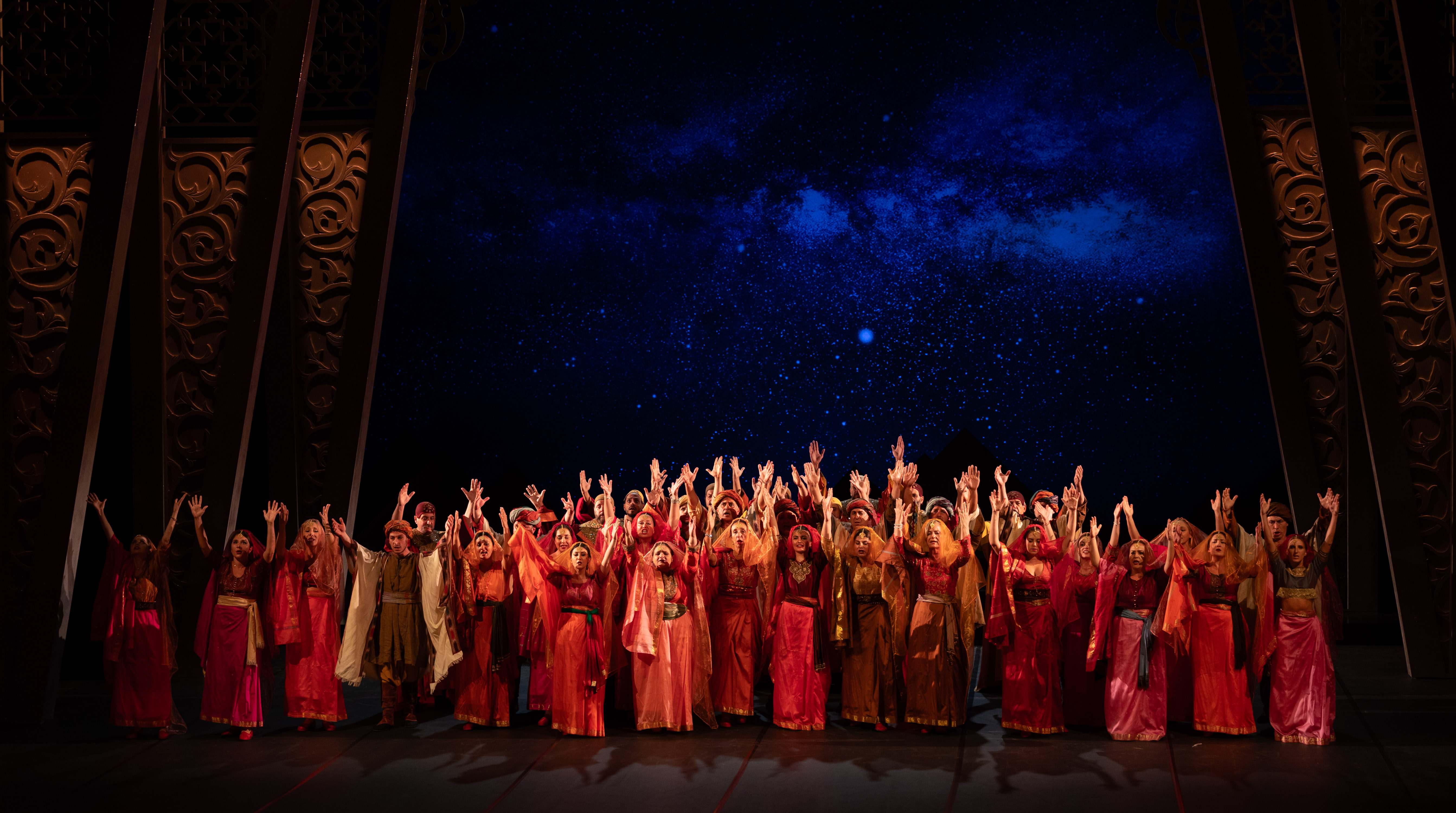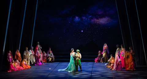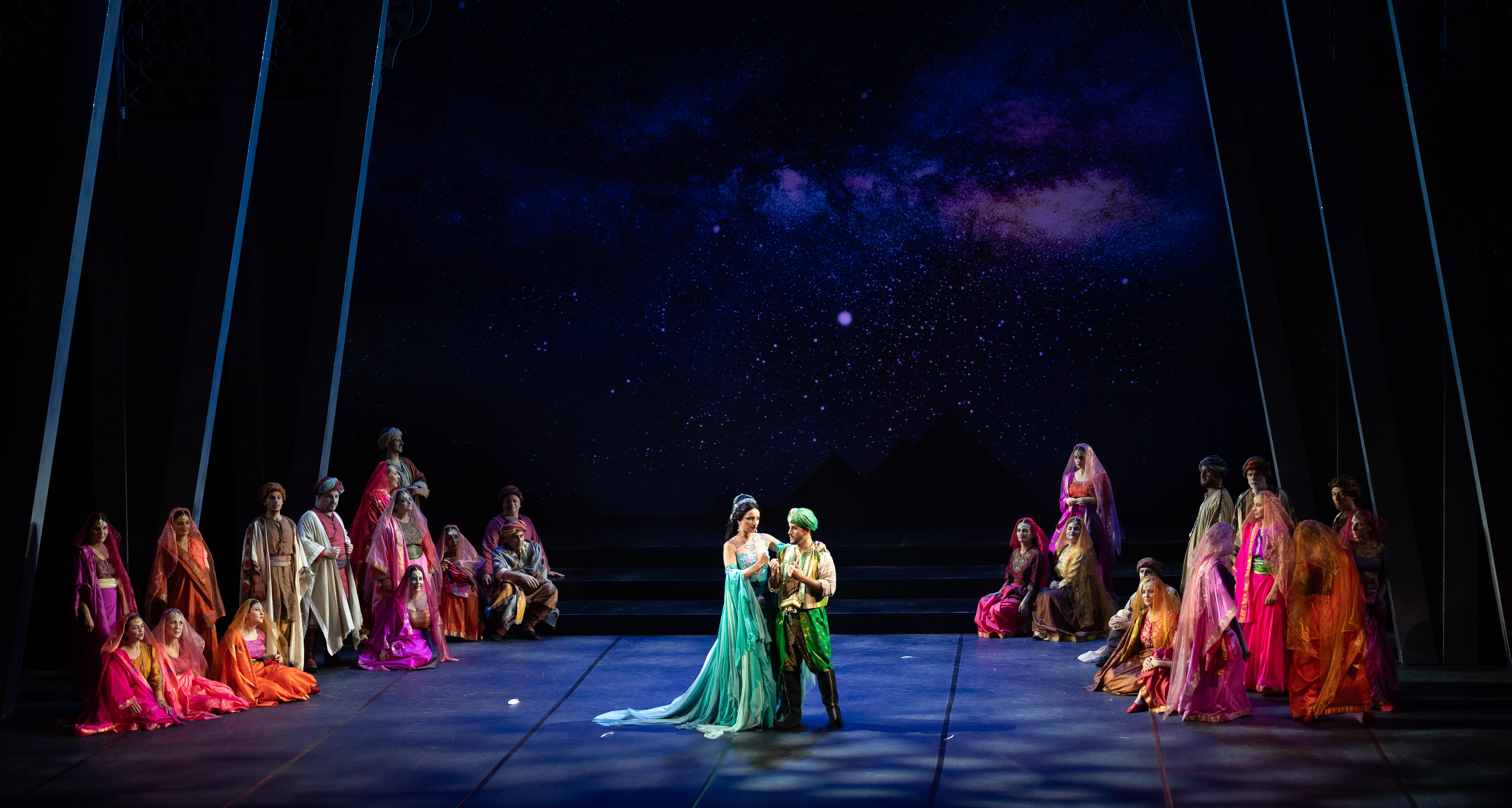 ‘Il flauto magico di Mozart’ ha per sua natura diremmo ‘mitica’ una sorta di aura magica che potenzialmente concede a registi e sceneggiatori di rimaneggiare il contenuto per adattarlo alle più svariate interpretazioni. D’altra parte spesso ci si affida al gusto dell’epoca o al momento storico in essere. Certo è che il mondo fiabesco cui si ispira il Singspiel di Mozart con le argute parole di Schikaneder ci porta sempre in una dimensione da sogno, che ci allontana per un po’ dal quotidiano e ci rimanda a qualcosa di misterioso grazie ai personaggi che l’opera stessa racconta. L’idea del regista Ivan Stefanutti in questo caso non intende assolutamente sconvolgere, e per fortuna aggiungiamo, il senso del libretto, anzi pur con una sua interpretazione, cerca di rendergli giustizia semplicemente cercando la magia raccontata nel mondo misterioso ed ampiamente celebrato dell’Oriente, con i profumi che possiamo immaginare e soprattutto i colori. L’atmosfera è soffusa su sfondi dai colori accesi e caldissimi, i costumi sono scintillanti ed anche se non possiamo definirla una imponente rappresentazione cinematografica, con il giusto quantitativo di elementi scenici ed una gestione drammaturgica intelligente, possiamo dire che il regista ha ottenuto il suo scopo.