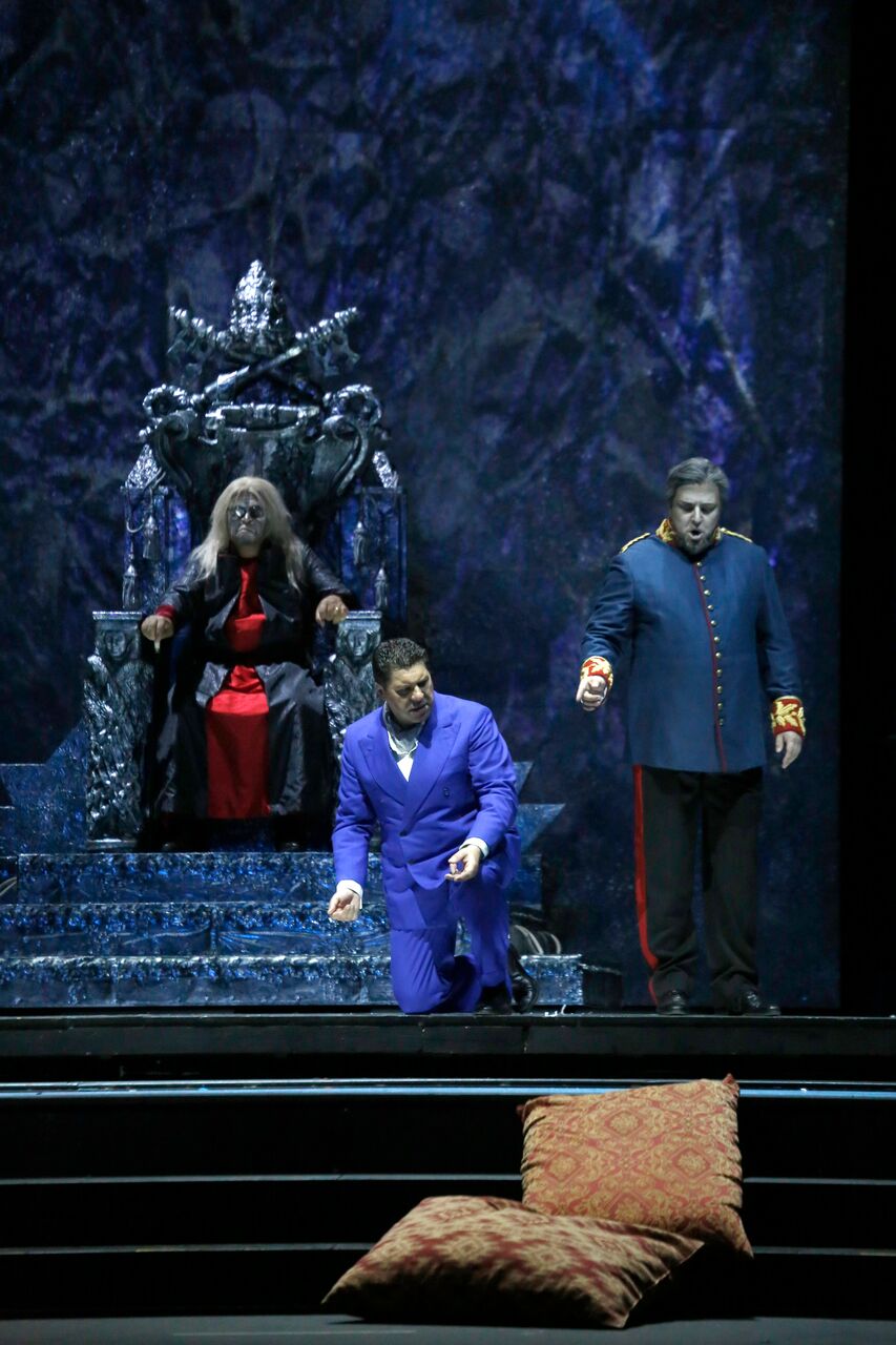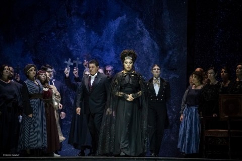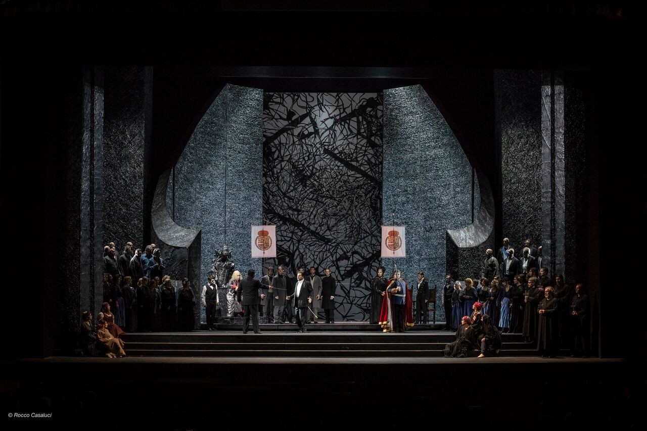 Non è andata secondo le aspettative la nuova produzione del mastodontico Don Carlo verdiano al Comunale di Bologna nell’allestimento firmato Henning Brockhaus, che si è avvalso delle scene di Nicola Rubertelli per concretizzare l’idea che aveva della grande opera andata in scena nella versione milanese del 1884. Quanto visto sul palco ci ha lasciato infatti piuttosto perplessi e non è stato compreso affatto dal pubblico. I motivi possono essere stati diversi. Siamo in una astrazione piuttosto modernista e cupa nel disegno del regista che evidentemente concepisce questo dramma di sconfitti a tuttotondo come una sorta di incubo senza uscita e piuttosto atemporale, visto il grigiore quasi spaziale e le stranissime strutture che solo lontanamente riconducono ad ambienti regali, con cuscini un po' stile indiano qua e là e pochi arredi vintage, su sfondi decisamente inquietanti. Le luci dello stesso regista spesso assumono toni scuri accentuando questo misto di angoscia e straniamento, che a nostro avviso non ha aiutato neanche gli interpreti a concentrarsi sempre sul canto. Come imbrigliati in quanto li circonda sembrano quasi straniati da loro stessi, su tutti Elisabetta, con qualche inevitabile slancio imposto chiaramente dal libretto. Lo spettacolo in generale è investito di una lentezza sconcertante che rasenta la noia soprattutto verso la fine, ed assistere alla vestizione monacale di Eboli sulla splendida introduzione dell’aria di Elisabetta ci è sembrato davvero ridondante. Anche i costumi di Giancarlo Colis sono cupi, tranne per l’ammaliatrice Eboli che però ci ricorda una soubrette anni Trenta, e Rodrigo in azzurro, forse ad indicare una luce nel suo operato. Inoltre non ci sembra coerente lo stile anni Venti/Trenta del coro femminile pur sulla leggiadra Canzone del velo, poiché fuori dal contesto generale. Non parliamo del povero Inquisitore, con occhiali scuri e chioma stile Albus Silente costretto in trono in scena quasi immobile per tutta l’opera.
