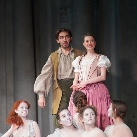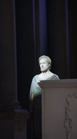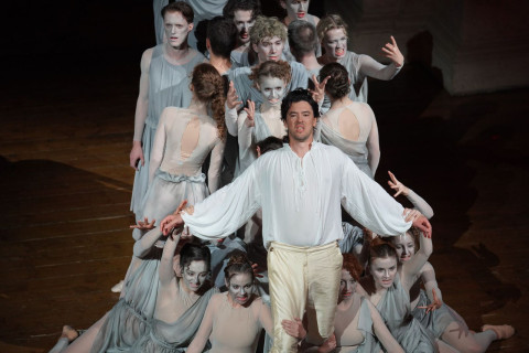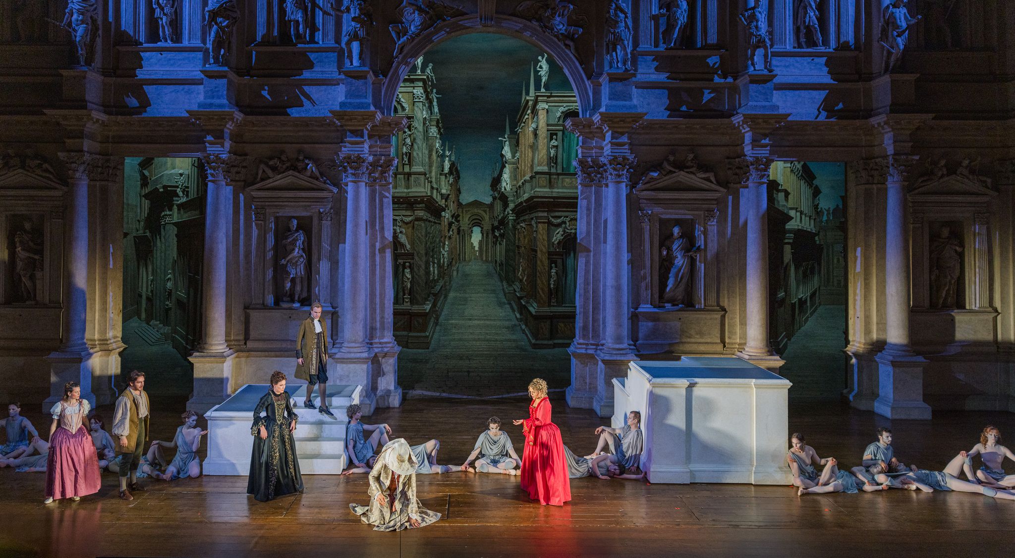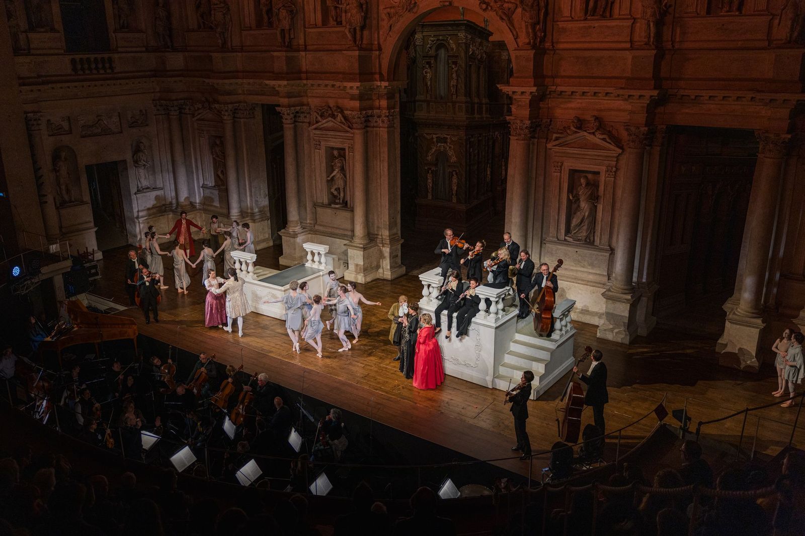 La scena, curata da Andrea Tocchio è ridotta a pochi elementi che suggeriscono un palazzo nobiliare, dialogava perfettamente con la scenografia fissa ed anche con l’incredibile acustica dell’Olimpico, esaltando il suono austero e rigoroso dell’orchestra diretta da Fischer. Una lettura asciutta, limpida, capace di far emergere la tensione interna della partitura senza mai indulgere al decorativo. Il Maestro ha scelto una rappresentazione in cui ciascuno si possa identificare, con un ruolo speciale da parte del corpo di ballo, formato dall’Ensemble di danza della Ivan Fischer Opera Company e dagli studenti della University of Theatre and Film Arts di Budapest: vere e proprie statue viventi, presenze eteree che si muovevano intorno ai protagonisti, diventando di volta in volta arredi, presenze simboliche o proiezioni delle coscienze dei personaggi. Doveroso fare i complimenti per le coreografie curate dal movement director Georg Asagaroff ed il movement coach Fanni Czvikli. Lasciando da parte ogni giudizio, il Direttore sceglie infine di omettere anche la morale del finale, per lasciare tutto in sospeso e godere semplicemente di quanto ci hanno lasciato le vicende narrate, con il protagonista inghiottito dalle anime dannate. Splendidi i costumi di Anna Biagiotti.