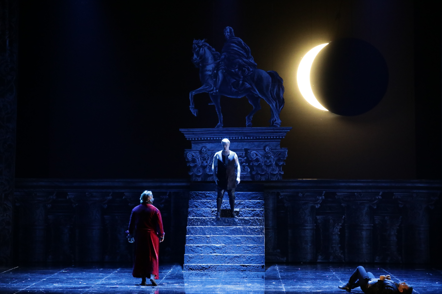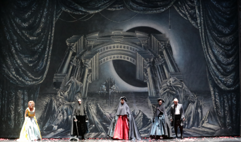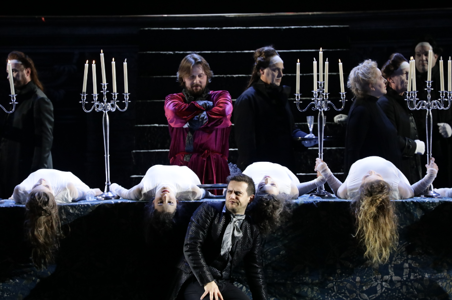 Il regista ritiene di avvicinare il pubblico al compositore ambientando la vicenda al suo tempo, e se dai costumi possiamo evincere facilmente il secolo, più generalizzato è il classicismo delle scene che ambientano la vicenda in una sorta di sogno vaneggiante del protagonista, con una serie di tavole che si alternano sullo sfondo tra cui la ‘Città ideale di Urbino’, che però è di fine Quattrocento, capovolta a simboleggiare un certo sconvolgimento dei valori sociali. Le luci creano un ambiente scuro e visionario, con tutta una cerchia di donne/fantasmi che ossessionano la mente del protagonista, poi convitate al banchetto decisivo di cui sono la ‘portata principale’ ed a tal fine sono disposte sulla lunga tavolata… (tra di esse vi è però una Elvira poco incline ad essere semplicemente un ‘pasto’).
