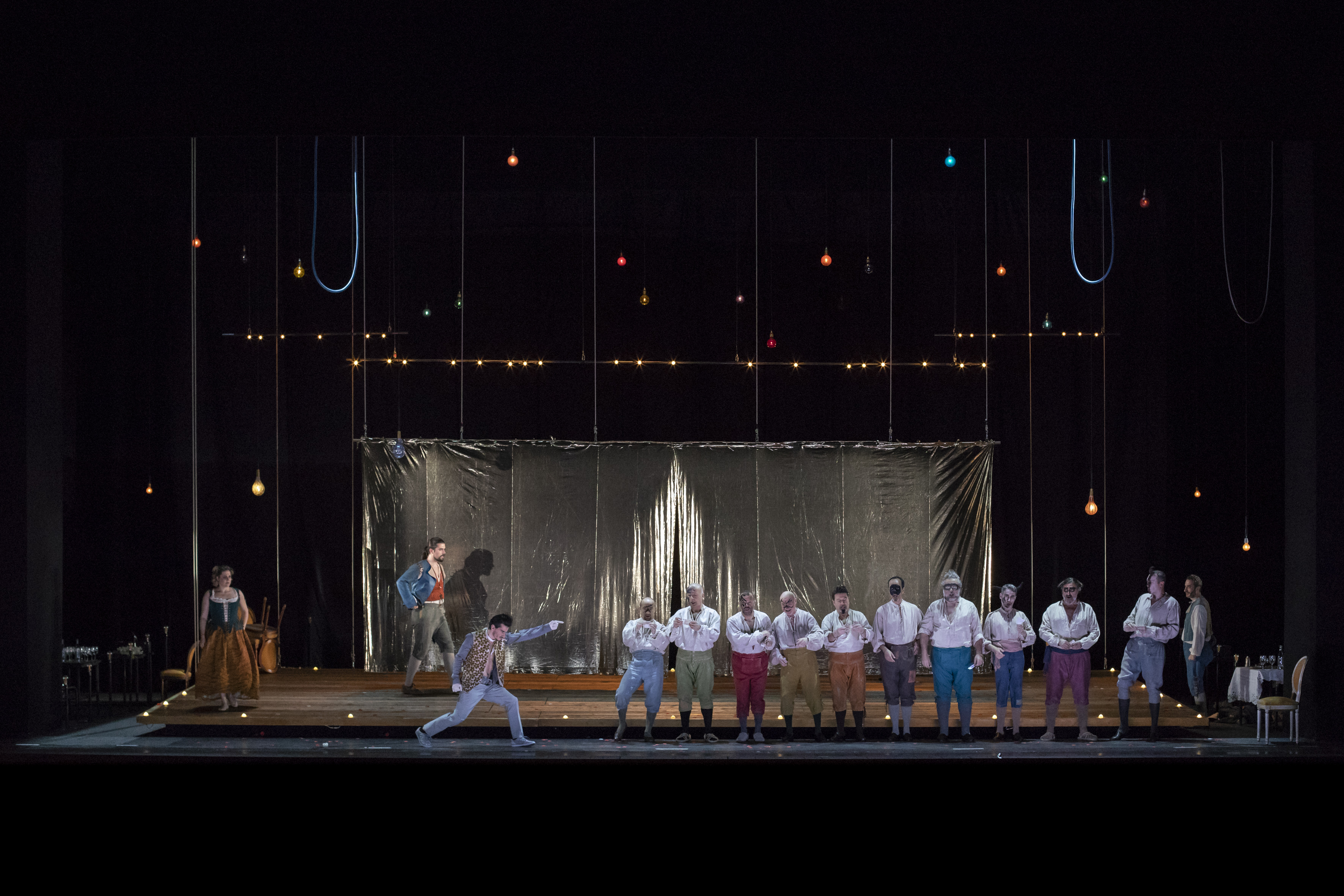 Con una produzione proveniente da Aix-en-Provence il Teatro Comunale di Bologna riporta sul suo palcoscenico il dissoluto mozartiano più discusso di sempre, con uno spettacolo particolarmente avulso dal contesto specifico ed in cui lo spettatore e gli interpreti in scena sono chiamati a fare la gran parte della fatica lavorando di immaginazione. Jean-François Sivadier è attore egli stesso e pertanto ciò che ha voluto mettere in risalto non è tanto il contenuto di quello che accade ma chi lo interpreta e come. Al Comunale la regia è ripresa da Rachid Zanouda e Milan Otal; Federico Vazzola è assistente alla regia. Poco ha dovuto lambiccarsi il cervello Alexandre de Dardel nel concepire il contenitore che avrebbe ospitato le gesta ed i movimenti di chi agisce, poiché il tutto avviene in una sorta di palcoscenico misto a sala prove in cui è facile intravvedere gente che si acconcia i capelli o si lima le unghie sullo sfondo, addetti alle attrezzerie e tecnici proposti al montaggio scene, e i personaggi stessi che indossano i costumi di Virginie Gervaise talvolta come in scena, oppure in ciò che a noi appare una semplice prova. Sivadier vede il protagonista come un uomo amante della libertà più che un semplice libertino con le donne, capace di abbattere (materialmente) le pareti che inibiscono la vita o creano schemi sociali. Tutto è molto reale e concreto, non vi sono apparizioni o sparizioni, lo stesso Commendatore torna in scena insanguinato per esporre le sue battute senza particolare atmosfera. Il buio del vuoto scenico, rischiarato solo da lampadine multicolore che scendono dall’altro, rende più palese lo status di precarietà tanto scenica, come se lo spettacolo fosse ancora da montare, quanto contenutistica, poiché poco accade di realmente pregnante a nostro avviso in scena.
