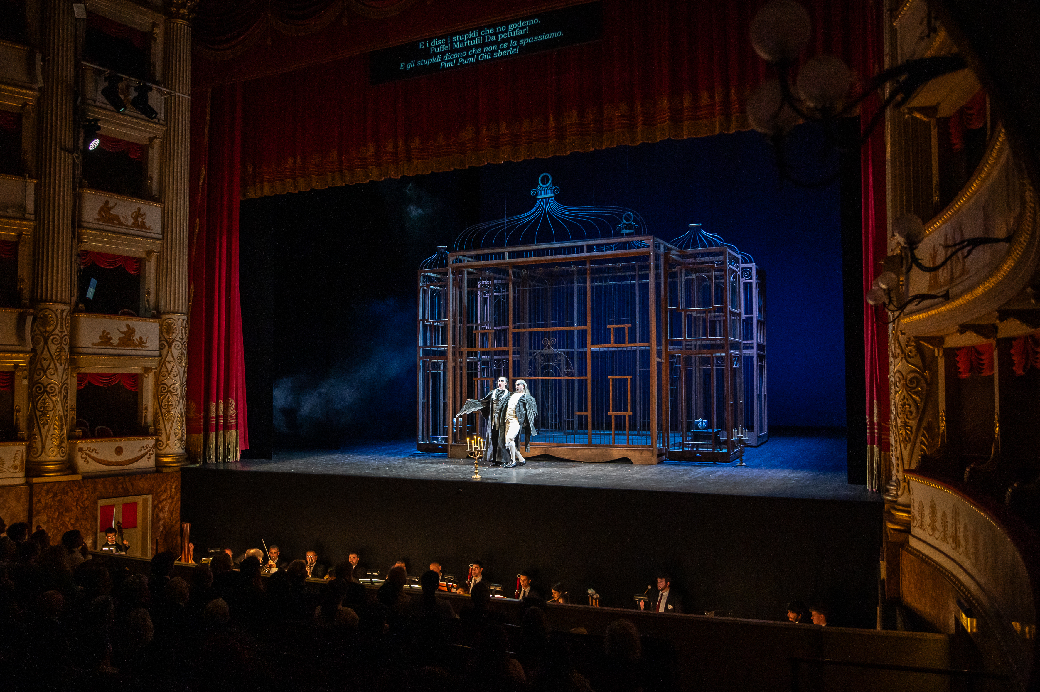 E proprio in questa apparente inattualità si manifesta una consapevolezza profondamente contemporanea. Al Teatro Comunale Pavarotti-Freni, questo equilibrio sottilissimo trova una realizzazione scenica di rara coerenza nell’allestimento proveniente dall’Azienda Teatro del Giglio, affidato alla regia di Aldo Tarabella, che evita ogni tentazione descrittiva per costruire invece un dispositivo teatrale perfettamente aderente alla natura musicale dell’opera. Ma è soprattutto la concezione visiva di Luca Antonucci, autore delle scene e dei costumi, a definire con forza l’identità dello spettacolo: lo spazio scenico non è più un interno borghese settecentesco, ma una vera e propria gabbia-voliera-casa, struttura insieme domestica e coercitiva, metafora visibile e concreta del sistema di controllo esercitato dai rusteghi. Non un ambiente, ma una condizione esistenziale. I personaggi si muovono all’interno di questo spazio come creature osservate, classificate, contenute, e i costumi sviluppano questa intuizione attraverso un raffinato lavoro di sintesi tra iconografia settecentesca e suggestioni ornitologiche, trasformando ciascun carattere in una presenza riconoscibile, dotata di una propria fisionomia gestuale e cromatica. Le luci di Andrea Ricci accompagnano questo universo con precisione quasi analitica, articolando lo spazio in zone emotive distinte e restituendo alla scena una mobilità continua, mai puramente decorativa ma sempre funzionale al racconto. Al centro di tutto resta però la musica, restituita con straordinaria lucidità dalla direzione di Giuseppe Grazioli, alla guida della Orchestra Filarmonica Italiana, che costruisce una lettura di esemplare chiarezza strutturale, fondata su un controllo rigoroso degli equilibri interni e su una qualità del suono costantemente sorvegliata. Gli archi si distinguono per compattezza e precisione, capaci di quell’articolazione leggerissima e flessibile che costituisce l’essenza stessa della scrittura di Wolf-Ferrari, mentre i legni intervengono con una presenza discreta ma decisiva, contribuendo a definire la trama drammatica con interventi di grande nitidezza espressiva. L’intero organismo orchestrale si muove con una naturalezza che non è spontaneità, ma risultato evidente di un controllo pienamente interiorizzato.