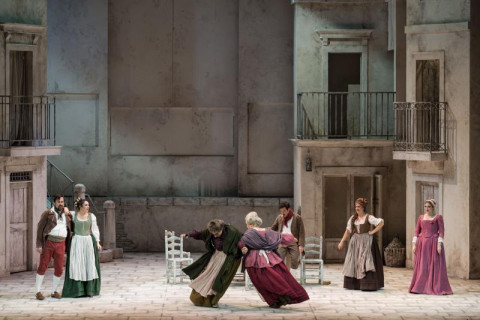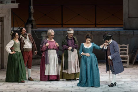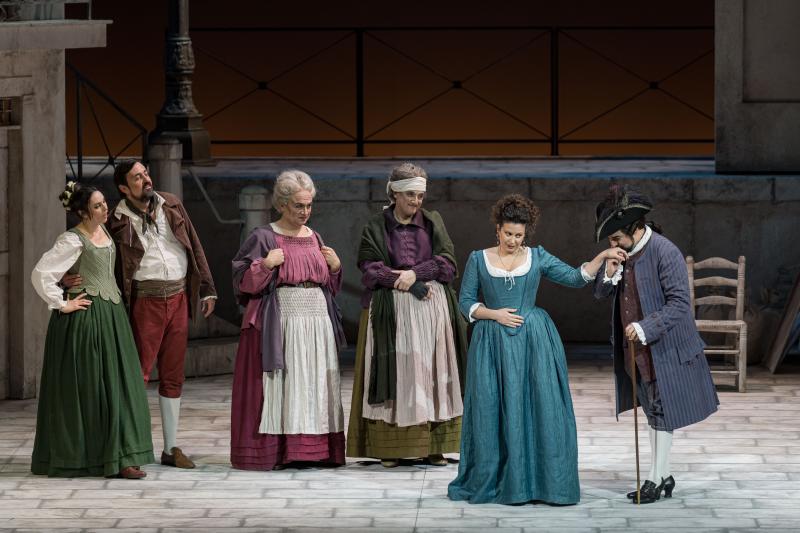 Per la prima volta a Verona, l’ultima opera del compositore veneziano si avvale della notevole direzione musicale di Francesco Ommassini che riesce, oltre a dirigere con precisione non indifferente l’ intricato amalgama contrappuntistico e corale di buca e palcoscenico, ad offrire una fresca e accurata lettura, sempre attentissima a non soverchiare il canto nel suo carattere discorsivo e colloquiale. Nel contempo Ommassini ne sa esaltare il ritmo e gli squarci lirici, assecondato da un’orchestra attenta e precisa in ogni settore, nitida, briosa, ricca di colori. La lettura ci è parsa magistrale, dove il recitativo naturale del dialetto veneziano, la levità mozartiana di molte pagine, le tenerezze melodiche di ispirazione pucciniana, la sottile ironia che pervade tutta la partitura, i raffinati intrecci polifonici e contrappuntistici, sono stati resi in maniera perfetta. Una lezione di garbo e di stile, che ha per così dire contagiato anche il team di regia diretto da Federico Bertolani (scene di Giulio Magnetto, costumi di Manuel Pedretti) che ci ha proposto sì la scena fissa del campiello veneziano, ma con uno sfondo che s'apre in particolari momenti dell’opera, dove appaiono in controscena altri gruppi di figure: Pantalone ed un gondoliere che accompagna Arlecchino e Colombina; quindi la bandiera della Serenissima, ammainata alla sua caduta; poi un vaporetto ottocentesco che trasporta due fidanzati; a seguire un vorticare di ballerini, e sgangherati suonatori in barcone. persino un tecnico che comanda le grandi barriere del Mose. Per finire, un gruppo di moderni turisti sbarcati da una gigantesca nave da crociera pronti ad invadere il campiello con i loro trolley, crea il coro conclusivo.
