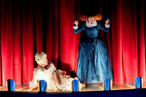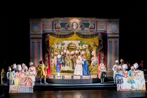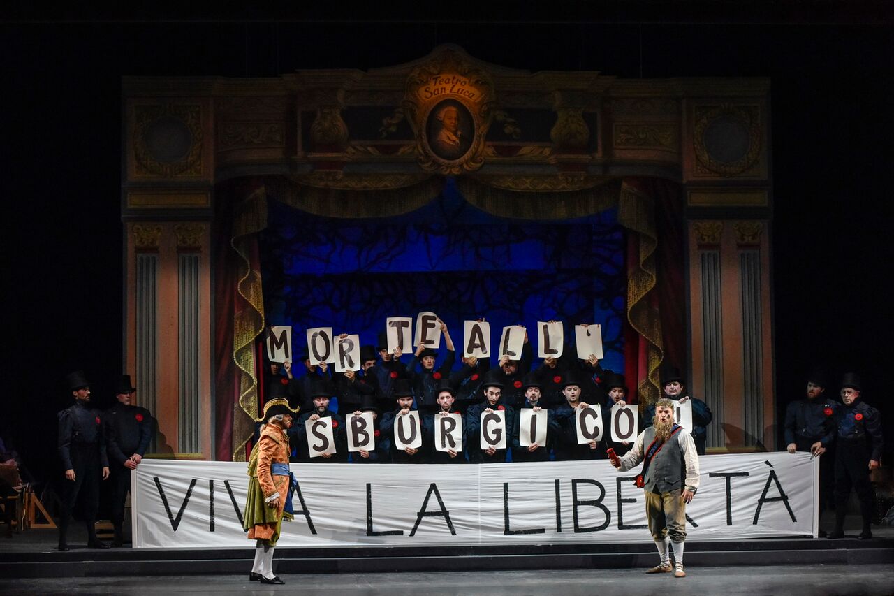 Con entusiasmo la regista Silvia Paoli ha accolto la sfida di mettere in scena la prima opera che il giovane Donizetti vide portata in scena e che come possiamo intuire ben presto scomparve dai calendari dei teatri lirici, sovrastata dal successo dei lavori successivi. Come fossimo alla prima rappresentazione del 1818 a Venezia la Paoli immagina di riportare la narrazione a quel giorno lontano in cui molto accadeva anche al di fuori dei muri teatrali, mostrando ciò che accade dietro le quinte di una produzione artistica, ma inserendo anche alcuni elementi della cronaca politica di allora. Un piccolo palcoscenico ideato da Andrea Belli si trova infatti al centro del palco vero, che roteando ci mostra di volta in volta anche ciò che accade dietro di esso. E la vicenda parte proprio dalle prove, con un sudatissimo Donizetti in ansia per questo debutto, e gli artisti che provano le rispettive parti, con tanto di prima donna capricciosa come ogni diva ama mostrarsi. Pare che la rappresentazione del 1818 ebbe diversi problemini dovuti al cast, che addirittura vide sostituita la prima donna Adelina Catalani per problemi di salute occorsi durante la rappresentazione. Qui viene quindi catapultata in scena la giovane sarta della compagnia per scongiurare il disastro e finalmente lo spettacolo può procedere. La storia è presto intesa: famiglie reali ed usurpatori, amori contrastati e matrimoni forzati, classiche agnizioni con conseguenti ascese sociali ed un bel lieto fine per fare contenti tutti. Interessante come la regista abbia chiesto di accentuare le mossette e le espressioni degli interpreti per richiamare un certo tipo di far spettacolo prescritto nell’Ottocento, il che porta anche a sorridere parecchio in certe situazioni. Inoltre gradevolissimi sono i disegni e gli abbellimenti del finto teatrino che creano una ambientazione sì delicata da accogliere tutto ciò che accade con leggerezza. I costumi inerenti l’epoca di Valeria Donata Bettella completano il quadretto d’insieme e la compagnia, oggi come allora, intrattiene con i suoi racconti il pubblico per circa tre ore di spettacolo che scorrono via piacevolmente.