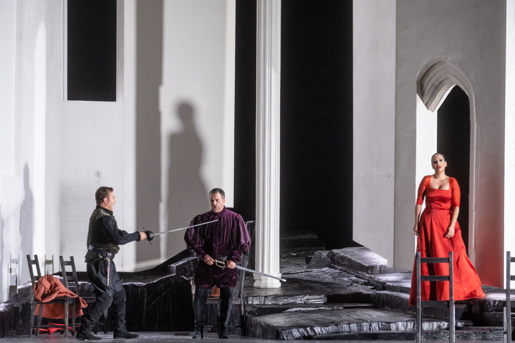 Lo spettacolo realizzato dal bolzanino Andrea Bernard delude un po’. L’inizio promette molto bene con un preludio accompagnato dalle immagini del giovane Ernani che seppellisce il padre e che sfumano sul palcoscenico dove ritroviamo il protagonista ormai adulto assorto sulla tomba del padre. Le idee però – se escludiamo le due apparizioni di un angelo guerriero-finiscono qui. Le masse sono manovrate molto bene nelle loro brevi apparizioni, ma le interazioni fra i personaggi sono routinarie e appena accennate. Peccato perché in altre occasioni ho potuto assistere a sue regie ben più interessanti e audaci. Forse un’occasione persa. Essenziali le scenografie di Alberto Beltrame che gioca con delle grandi pareti bianche ispirate all’architettura spagnola e che ben risaltano sul fondale scuro e sul pavimento roccioso (che mi è sembrato anche un po’ pericoloso visto lo scivolone del baritono) . Non memorabili i costumi di Elena Beccaro e il disegno luci di Marco Alba.