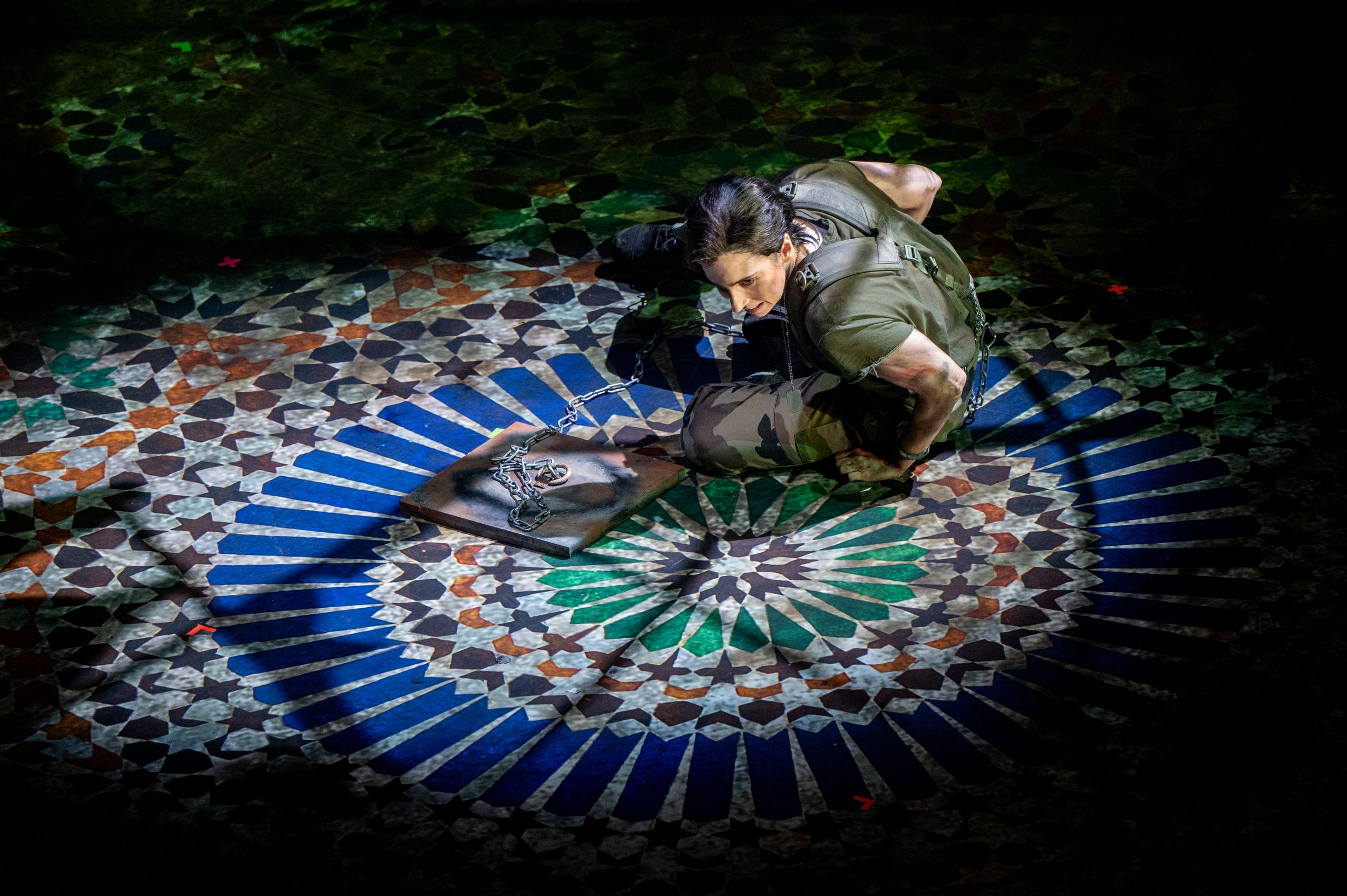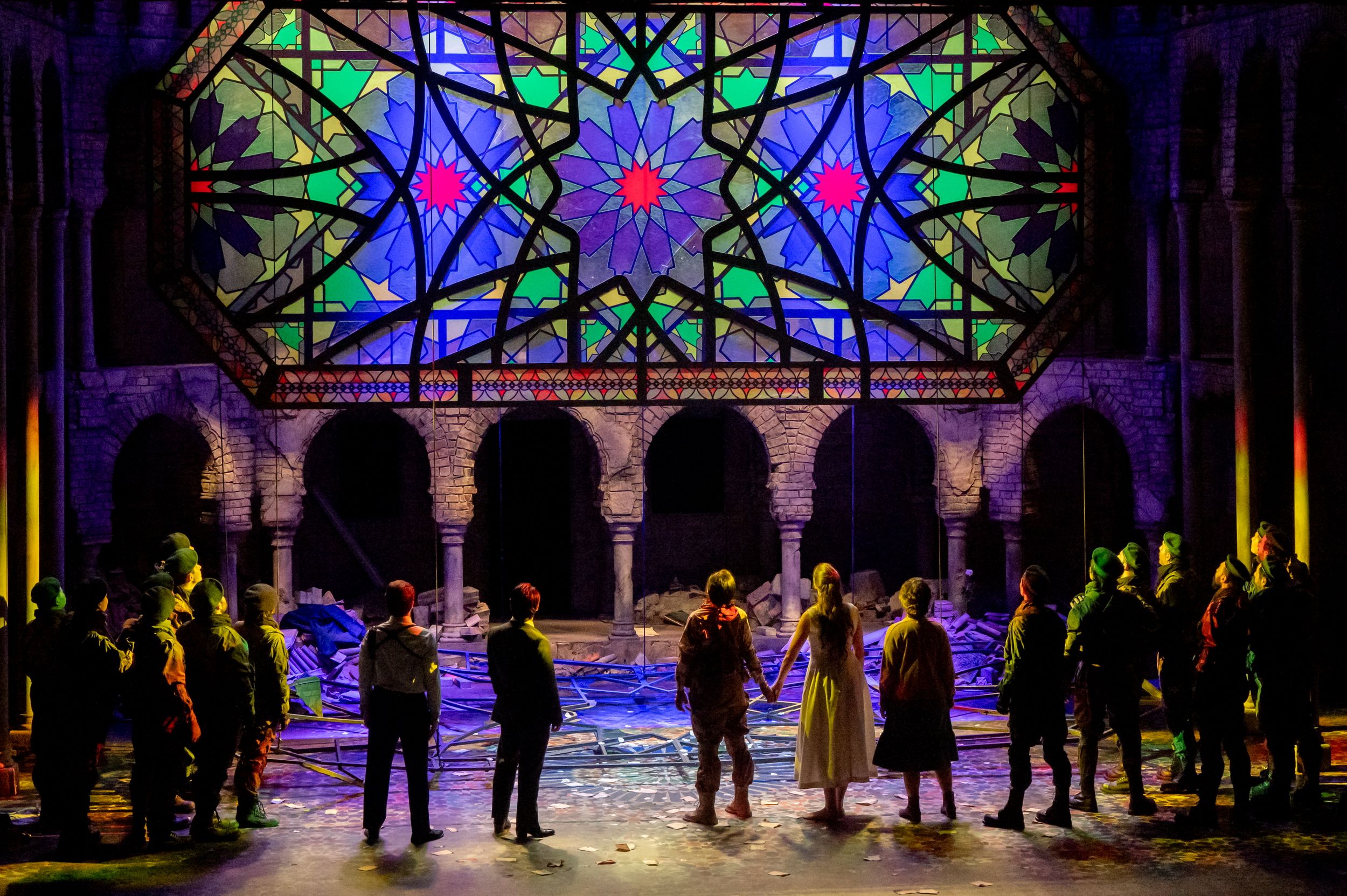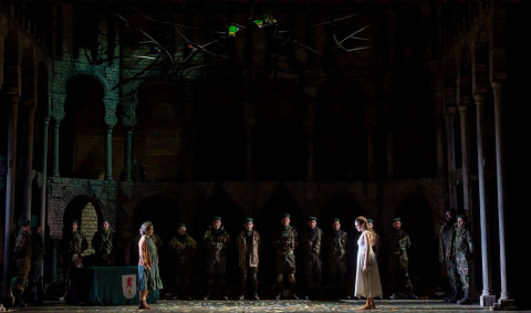 La scelta di ambientare l’opera in un conflitto indeterminato, popolato da soldati in tuta mimetica da cecchino, pare essere una mera allusione all’attualità, riflettendo l’ineluttabile perdita che la guerra porta con sé. In questo modo, le figure di Zoraida e degli altri personaggi sembrano muoversi in un contesto che trascende la specificità storica della trama, annegando nel generale disorientamento di un conflitto senza tempo. Le donne, vestite con abiti semplici, in una sorta di reminiscenza degli anni '60, e i tiranni Almuzir e Almanzor, abbigliati con giacca e cravatta, appaiono estranei all’intensità drammatica della situazione, incapaci di restituire la minaccia e la tensione che dovrebbe definire il contesto di assedio e guerra intestina.