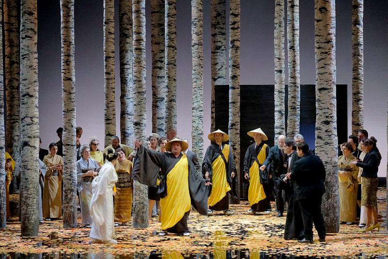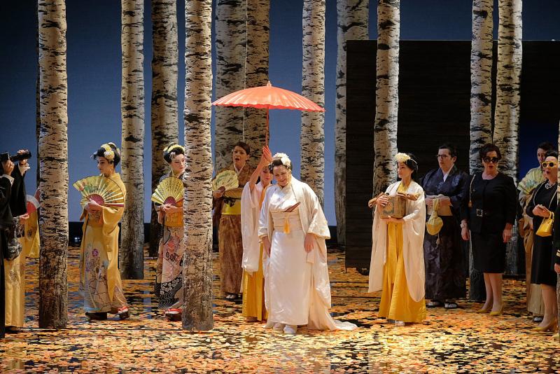 Il regista Andrea Cigni, coadiuvato nelle scene da Dario Gessati che descrive un bosco di betulle altissime delle quali non ci è dato di scorgere la chioma e nei costumi da Valeria Donatella Bettella, che mescola sapientemente kimono con giacche e t-shirt contemporanee, fa sua l’idea pucciniana di una tragedia dove la generale ambientazione giapponese risulta in apparenza appena accennata ma che in realtà investe ogni cosa, sempre tesa a mettere in luce l’anima della protagonista.