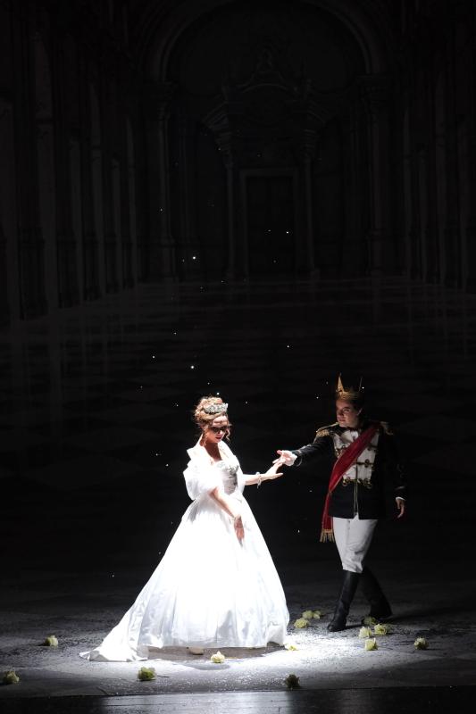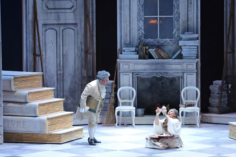 L’elemento originale più significativo è l’amore di Angelina per i libri, un tratto non presente nel libretto ma integrato nella messinscena attraverso soluzioni visive suggestive. Durante la Sinfonia, le sorellastre distruggono simbolicamente la biblioteca di famiglia per installare le loro stanze, mentre grandi volumi, dedicati a celebri eroine letterarie appaiono ai margini del palco. Questo dettaglio, unito alla presenza di ballerine classiche che accentuano l’atmosfera fiabesca, imprime alla narrazione un carattere favolistico, quasi infantile, in sintonia con il contesto rossiniano.