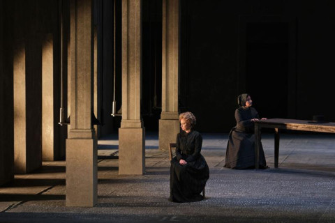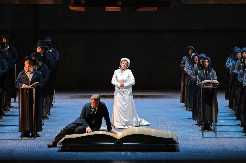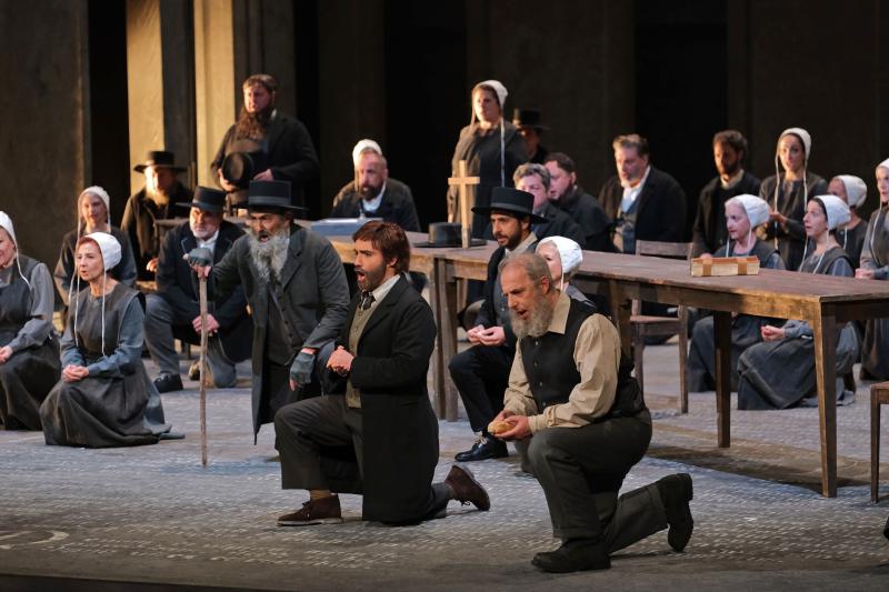 Questa potenzialità è stata ribadita al Teatro Filarmonico di Verona, dove Stiffelio è andato in scena per la prima volta nella sua storia. L’ allestimento proveniente dal Regio di Parma, ideato da Francesco Calcagnini con la regia di Guy Montavon, si concentra tutto su un’estetica sobria e monocromatica: ambienti essenziali, pochi elementi di scena e un grigio dominante sia nelle scenografie che nei costumi di Francesco Calcagnini. La regia rigorosa e composta si ravviva grazie a un sapiente gioco di luci fredde, che accompagna i momenti più intensi. L'ambientazione, rigorosa e ridotta all’essenziale, si trasforma con pochi dettagli nei vari luoghi della storia. Un'atmosfera soffocante e chiusa avvolge il dramma, rispecchiando la rigidità della piccola comunità protestante, dove dominano tinte scure: grigi e neri scandiscono ogni figura, risaltando sullo sfondo. Spiccano tra questi il rosso aragosta della redingote del seduttore, Raffaele, e il bianco dell’abito di Lina, simbolo di purezza nell’ultima, fugace apparizione. In sintesi, uno spettacolo essenziale nei gesti, ma quantomeno chiaro nello svolgimento d’una vicenda non facilissima da afferrare.