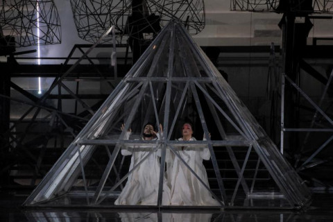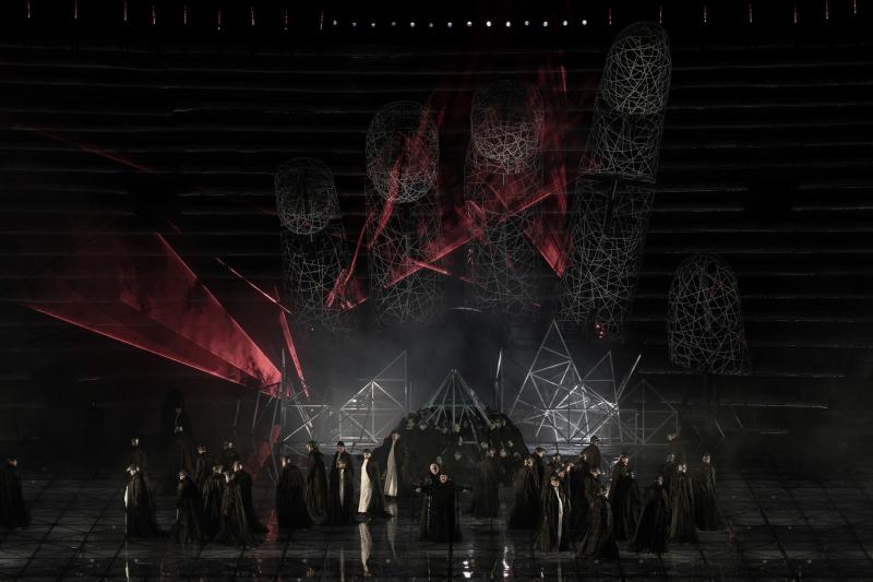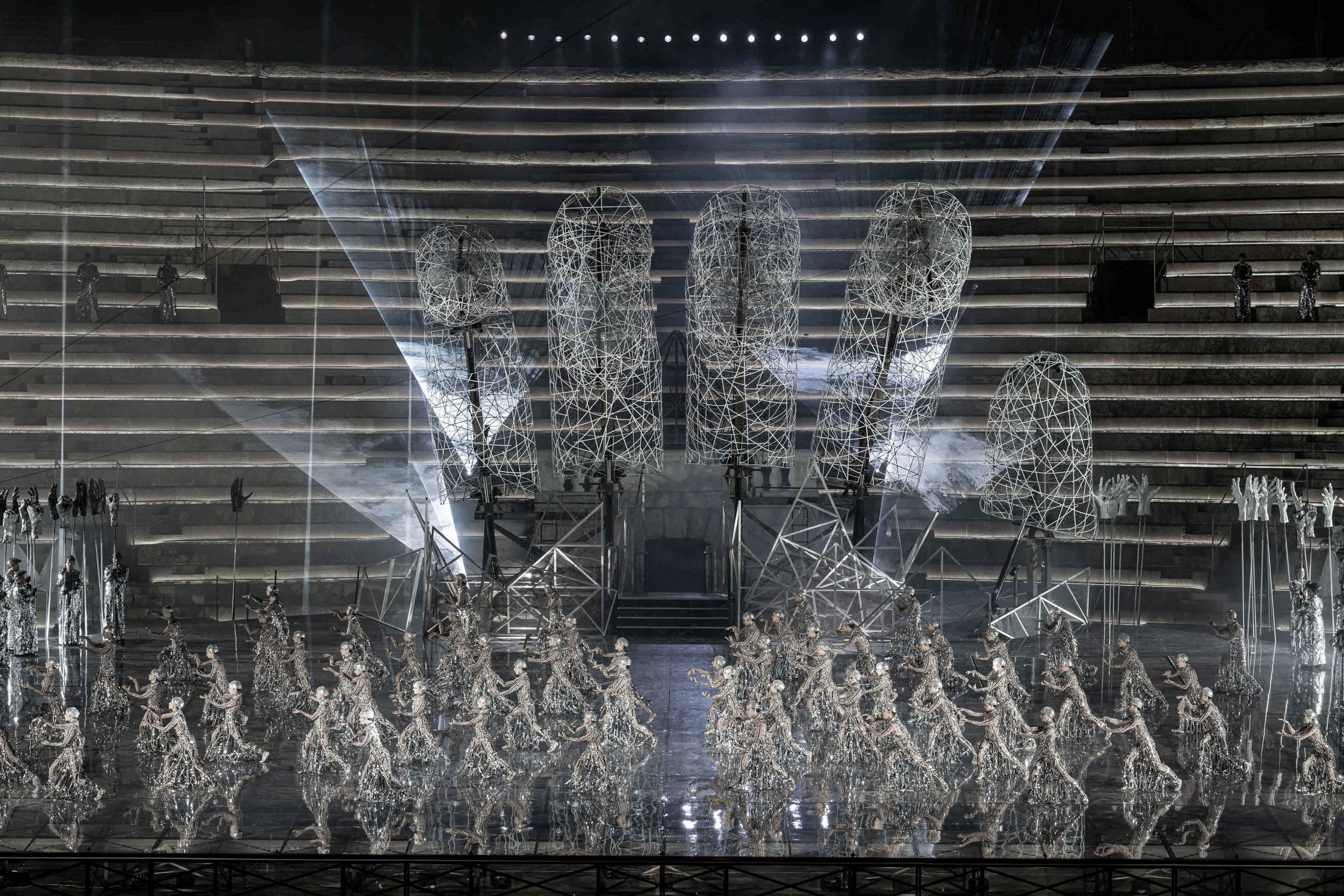 Per tanto clamore non bastava una Aida tradizionale a riempire gli schermi di tutto il mondo: evidentemente si deve aver pensato che ci voleva qualcosa di più tecnologico, accattivante per un pubblico così vasto e probabilmente fruibile dal punto di vista televisivo. Ecco che la scelta del regista è caduta su Stefano Poda, il quale già in altri allestimenti ha mostrato di non cedere affatto alla tradizione per scoprire nuovi orizzonti della narrazione operistica, che peraltro trovano sempre un filo conduttore molto simile a nostro avviso. Chi si aspettava uno spettacolo di puro fascino per viaggiare nel tempo passato mentre assaporava le bellezze della musica verdiana è rimasto sicuramente deluso perché il viaggio c’è stato, ma verso il futuro, la tecnologia, gli effetti sonori, i costumi avveniristici e le proiezioni luminose nel cielo. Anzi l’intento del regista era proprio quello di contrapporre un passato ormai disgregato (una colonna distrutta alla destra del palco in evidenza) con un avvenire robotico e sempre più asettico come il palcoscenico di questa produzione, che in estrema sintesi è una gigantesca installazione d’arte contemporanea in cui si anima uno spettacolo modernissimo, ma sulle musiche dell’Aida di Verdi. Poda ci vede anche del dantesco nella dicotomia tra il male delle ingiustizie subite dal popolo etiope, e quindi effetti visivi cupi con abilissimi mimi che simulano ombre demoniache spalmate sul palco, ed il bene cui alla fine si arriva con il sacrificio degli amanti. L’Egitto è solo sfiorato con dei lampi atti a ricordarci dove siamo in teoria, si veda la presenza di mummie, alcuni figuranti nel ruolo di Anubi, la forma piramidale che assumevano sia le luci che alcune strutture poste sul palco. Ma il pathos, il misterioso giogo che tiene incollati alle proprie seggiole gi spettatori da oltre un secolo e mezzo in ogni parte del mondo purtroppo ci è effettivamente mancato.