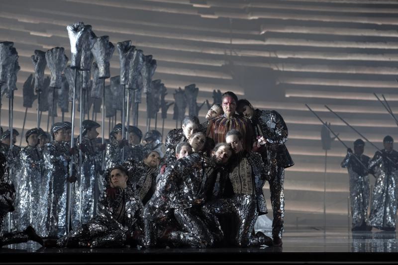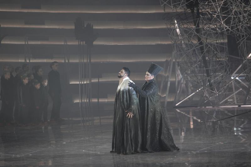 Dal punto di vista musicale si registra un lieve ritardo dell’inizio della rappresentazione dovuto ad un veloce scroscio di pioggia, il che forse ha un po’ destabilizzato cantanti ed orchestra che sono sembrati leggermente ‘guardinghi’, come a prendere essi stessi le misure dello spettacolo, che poi è andato avanti senza intoppi. Un po’ fastidioso però il rumore degli effetti di fumo continuamente sparati in scena. Protagonisti in senso totale i due amanti dal destino segnato, tanto musicalmente quanto dal punto di vista interpretativo: con un allestimento in cui succede di tutto bisogna tirar fuori tanta personalità e concentrazione per non perdere il filo e soprattutto l’anima del personaggio. Così Aida è una irrefrenabile Anna Netrebko, che anche nelle serate più complicate del solito tira fuori quanto di più talentuoso ha in sé per proporre un personaggio di valore, forte ma sensibile, credibile nel dolore e nella fierezza dell’ultimo sussurro, con una voce che ancora una volta sa tuonare tanto forza e vigore quanto dolcezza e sensibilità; similmente quanto scritto più volte su Yusif Eyvazov si riconferma con il suo Radamès: il tenore canta con correttezza in modo chiaro e con certe finezze che mostrano impegno, professionalità e generosità in un ruolo che evidentemente sente proprio come suo. Roman Burdenko non ci sembra invece aver trovato una chiara dimensione interpretativa in questo spettacolo, ove come detto ci vuole tanta personalità affinché il personaggio emerga: il suo Amonasro si scalda man mano vocalmente, ma resta un po’ asettico rispetto al grande carisma richiesto dalla parte. All’opposto invece Olesya Petrova cerca nella sua Amneris una dimensione forse eccessivamente aggressiva, che soprattutto vocalmente sfora spesso nella rabbia piuttosto che nel canto sfaccettato ma equilibrato che il ruolo della donna volitiva e pur sempre innamorata richiederebbe. Michele Pertusi porta in scena un austero e pertinente Ramfis; il re è interpretato dal sempre corretto Simon Lim; chiudono il cerchio il Messaggero di Riccardo Rados e la Sacerdotessa, Francesca Maionchi. Un plauso va fatto a tutte le comparse, ai mimi ed al coro splendidamente diretto da Roberto Gabbiani, per aver completato con valore e preparazione questo immane e variegato spettacolo.