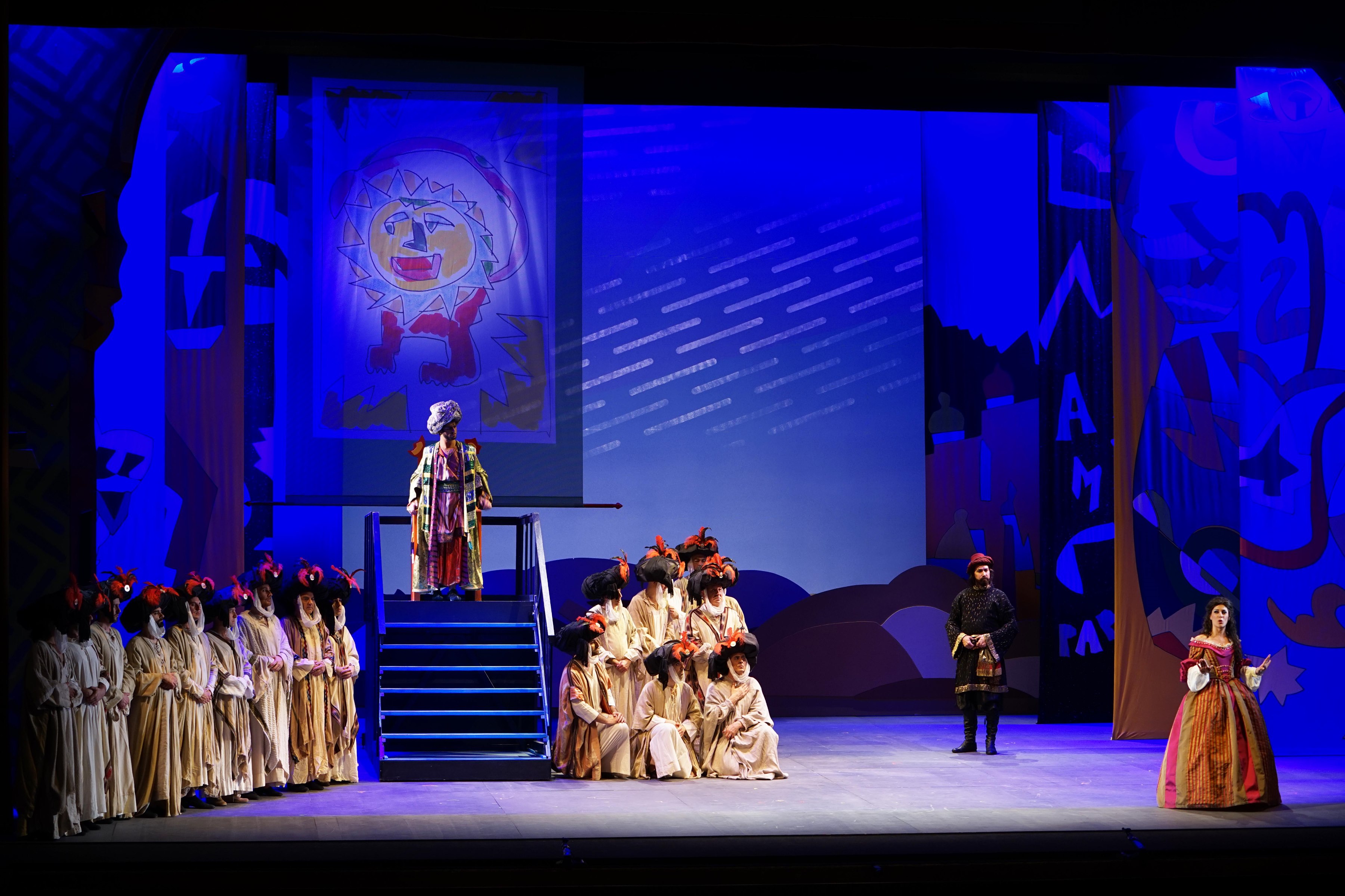 Una produzione che vede negli interpreti il punto di forza, inseriti perfettamente nello spirito fresco e spumeggiante dei colori in scena. Su tutti brilla di luce propria il Mustafà di Carlo Lepore. Se è vero che certi interpreti sono nati per fare gli artisti, questi in particolare è un mattatore caparbio e capace di fare spettacolo anche con un palco buio e niente altro in scena, figuriamoci con dei compagni che gli fanno da ottima spalla e con tutto ciò che Vizioli gli offre. La voce è magnifica: sonoramente scura, affabulatrice e perfettamente controllata da un interprete perfetto. La mogliettina bistrattata Elvira è Daniela Cappiello. Già conosciuta per ruoli brillanti in precedenti produzioni, ci conferma essere interprete spigliata utilizzando la voce acuta e sottile per esaltare il carattere in questo caso della lamentosa respinta, ma con estrema efficacia scenica e simpatia, che comunque alla fine la vince sul marito. Davvero un colore interessante il timbro vocale di Irene Molinari, Zulma, ottima spalla per Elvira. Haly è un corretto ed affidabile Dongho Kim, sia scenicamente che vocalmente, mentre assai spiritoso è il Taddeo di Biagio Pizzuti , anch’egli protagonista scenicamente e bravissimo nel rompere la scatole a Mustafà. Francisco Brito è un Lindoro delicato e gentile, dalla voce non volumetrica ma carezzevole e certo adatta al ruolo dell’innamorato sdolcinato. Dulcis in fundo la Isabella di Vasilisa Berzhanskaya. Ebbene è uno di quei mezzosoprani inequivocabili, dal timbro incredibilmente scuro sui gravi ma che rende molto efficacemente anche salendo sull’acuto. La sua Isabella è però una donna così volitiva e decisa da sembrare quasi sempre arrabbiata, di conseguenza anche l’uso della voce talvolta è marcatamente stretto, sì da sembrare poco naturale. Magnifiche sono le agilità e la tenuta sul fiato. Speriamo di sentirla anche in ruoli drammatici.
