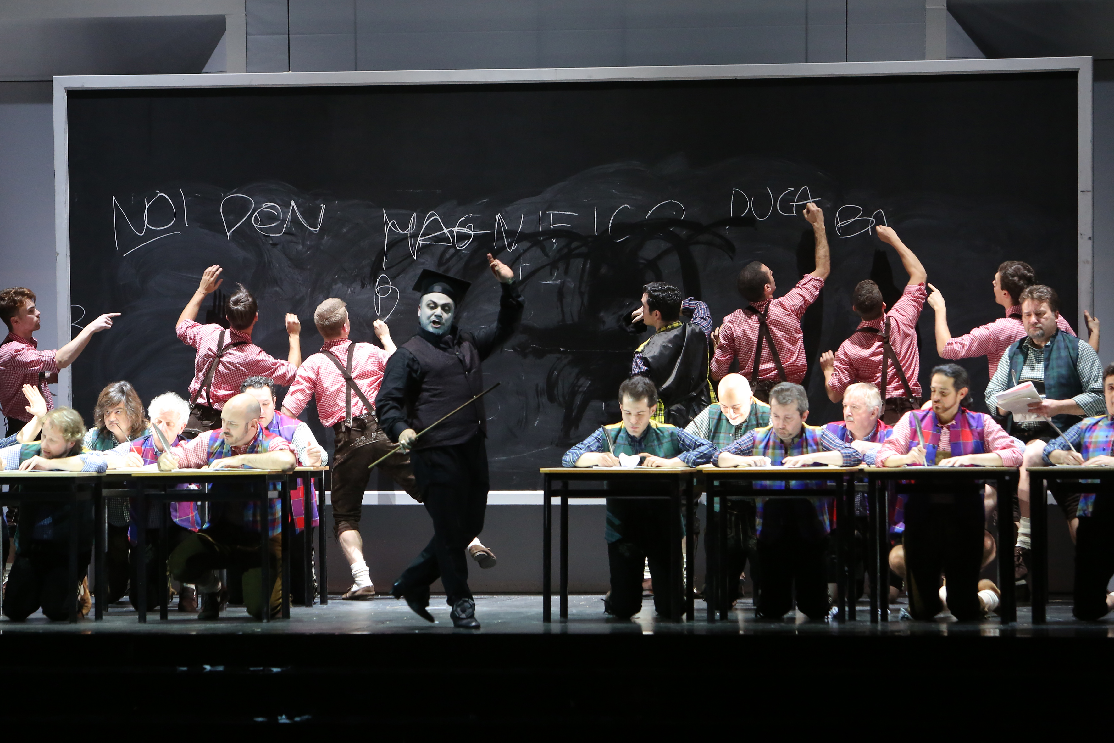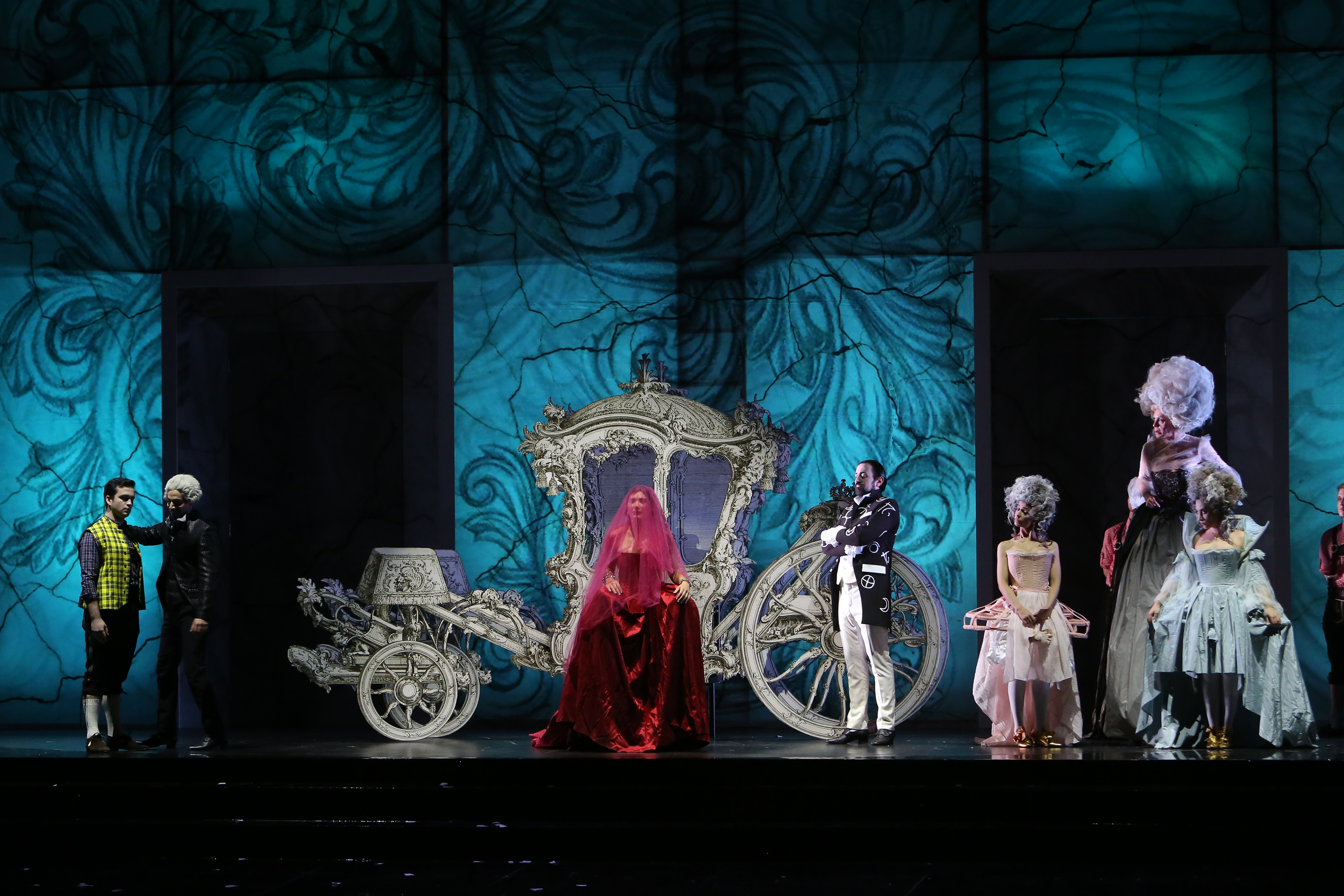 Nessun dubbio sulle qualità artistiche della Angelina di Annalisa Stroppa. L’interprete è baciata da una voce particolarissima per colore e qualità tecniche, dalle agilità perfette ed una musicalità incredibile. Un piacere ascoltare anche il suo principe ‘in disguise’, il Ramiro di Xabier Anduaga. Questo giovanissimo tenore sicuramente farà parlare di sé per bellezza del colore e capacità interpretative. Canta con vivace slancio e carattere e sicuramente con l’esperienza affinerà ancor più la tecnica. Grandissimo mattatore il don Magnifico di Marco Filippo Romano, un leone alla caccia della preda da sbranare con tutto il suo patrimonio, addirittura in cattedra con le sue massime imperdibili; ma le cose vanno male ed allora fare buon viso a cattivo gioco è l’unica cosa che resta, ed il baritono la sa lunga su come stare in scena e catturare l’attenzione, tanto col canto che con la recitazione disinvolta. Non da meno il Dandini di Alessio Arduini, altro campione di stile attoriale, per cui ogni gesto ha un significato preciso a supporto di una voce salda e brunita. Solida è anche la voce dell’impeccabile Alidoro di Gabriele Sagona, austero e tutto d’un pezzo per interpretazione e canto. Simpatiche, capricciosette, rompiscatole, ma alla fine ree confesse le sorellastre Irina Ioana Baiant e Alice Marin, rispettivamente Clorinda e Tisbe.