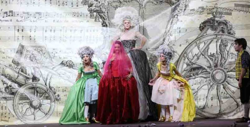 Tutto questo è infiocchettato da scene essenziali ma graziose: una parete semovente e cangiante ci trasporta nei vari ambienti richiesti, con gli arredi giustamente giganteschi per riportarci alle prospettive di piccoli attori, la carrozza che sembra uscita da un quadro naïf; i costumi e le parrucche, sempre opera del regista, che usa sapientemente anche il gioco luci per creare le atmosfere, sono pazzerelli e vivaci come usciti dalle menti di giovanissimi disegnatori.