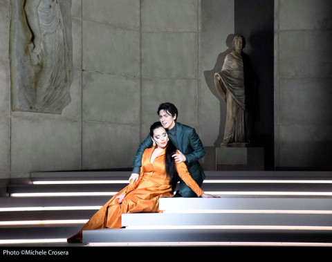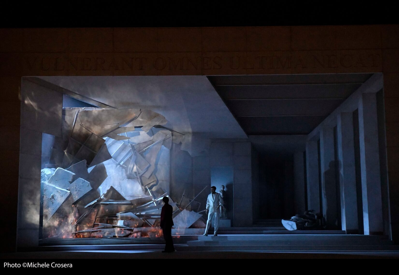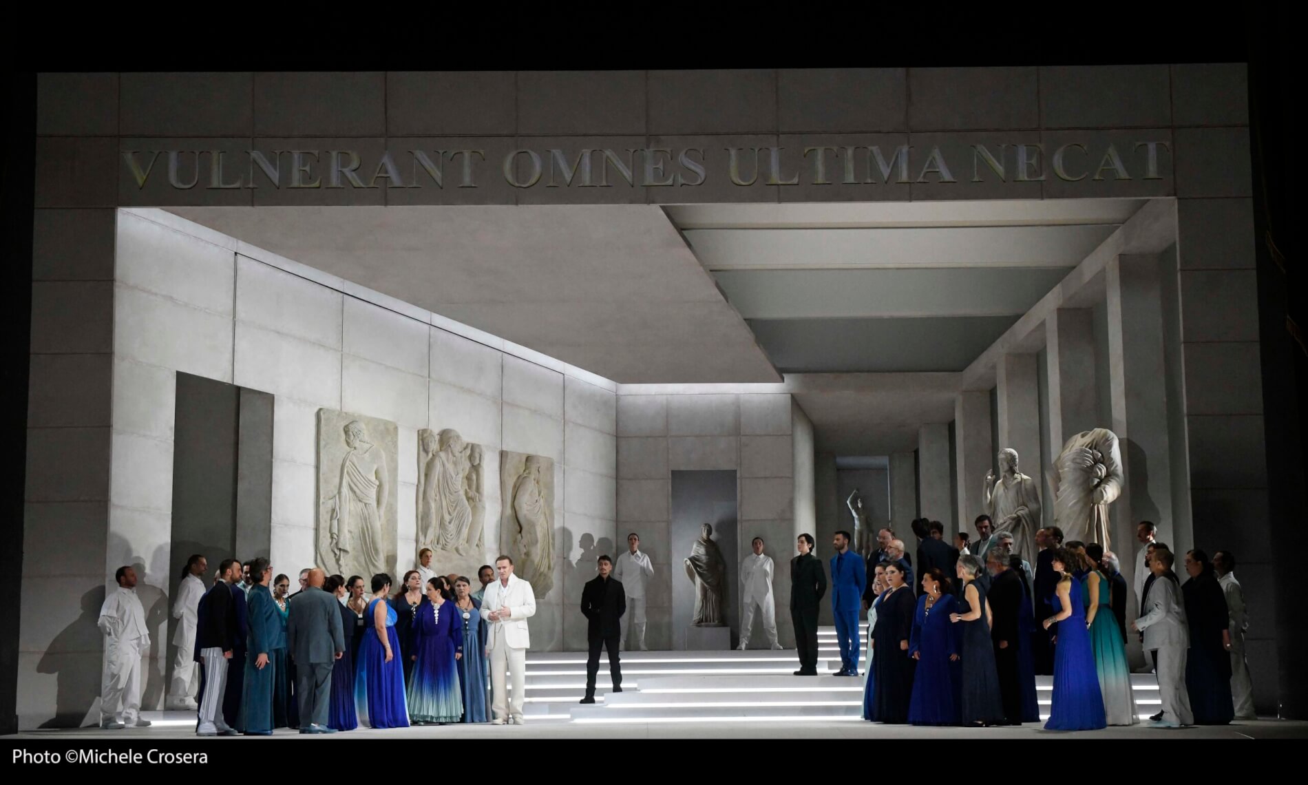 Con questo allestimento, La Fenice ha voluto sottolineare l'attualità del capolavoro. Come ha spiegato il regista Curran, il tema della "clemenza" e la capacità di perdonare sono concetti che dovrebbero ritrovare centralità nel vocabolario contemporaneo, in un mondo segnato dall'estremismo. Questa visione etica è stata proiettata in scena attraverso l’ambientazione (scene e costumi molto belli di Gary McCann e light design fondamentale di Fabio Barettin) che trasferisce il dramma in una contemporaneità astratta. Il primo atto, ambientato in un asettico palazzo-museo che evoca l'antichità con statue e bassorilievi, stabilisce un rapporto diretto tra l’eredità romana e un presente in cui i personaggi vestono abiti con un vago richiamo a epoche passate. Questa scelta estetica, pur non risultando sempre incisiva, pone l’ordine classico come un riferimento statico su cui si proiettano i conflitti emotivi attuali. Un elemento simbolico di grande effetto è il tipico motto delle antiche meridiane che dominava la scena: Vulnerant omnes, ultima necat, monito sulla fugacità dell'esistenza e sul peso delle scelte individuali.