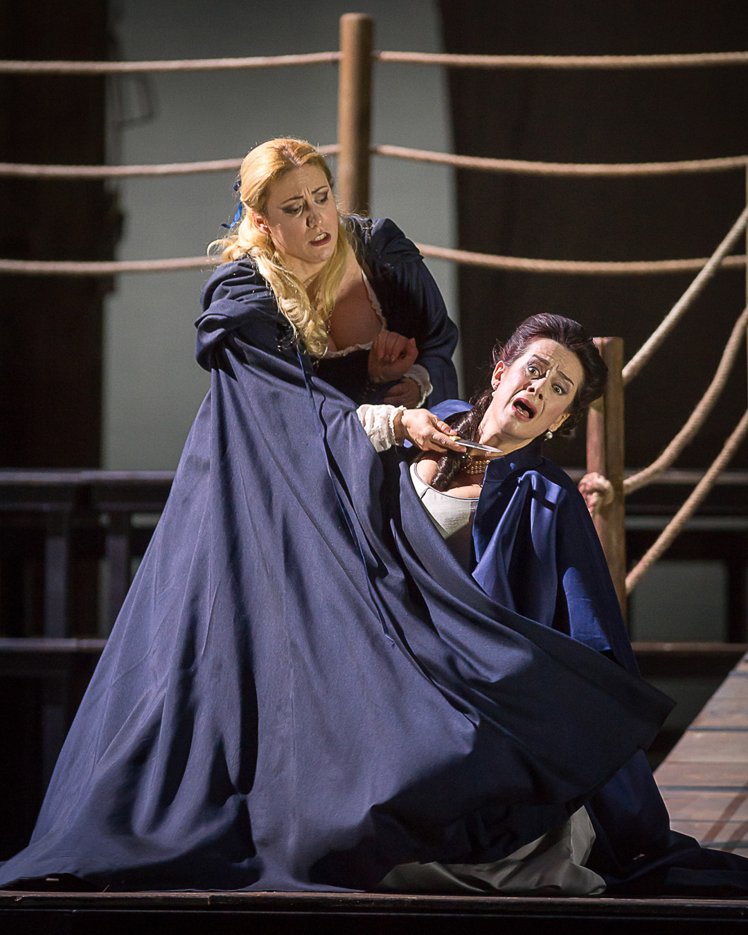 Un cast non perfettamente omogeneo ha animato la recita del 23 a Modena, ma qualche piccola defaillance non ha inficiato sulla buona riuscita dello spettacolo. Particolarmente interessante la voce della protagonista, Saioa Hernández, che vanta tanto una robustezza di suono ben appoggiato sul grave che acuti squillanti e corposi, uniti ad una interpretazione convincente. Quasi impercettibile un piccolo problemino occorso durante il terzetto dell’atto quarto. L’uomo da lei amato, ma che ovviamente non ricambia i suoi sentimenti, è l’efficacie Enzo di Francesco Meli nella cui voce morbida sta tutto il sentimento dell’uomo appassionato e che sottolinea con molto vigore ogni parola pronunciata. Enzo adora ricambiato la moglie del capo dell’Inquisizione, la dolce ma infedele Laura, un’ottima Anna Maria Chiuri dalla voce intensa quanto i sentimenti portati in scena, uniforme che sale molto facilmente nonostante la tessitura squisitamente da mezzosoprano. Il cornificato consorte è Alvise Badoero, alias Giacomo Prestia, che apprezziamo ogni qualvolta interpreta ruoli di carattere forte coadiuvato dalla voce profonda che intima rispetto. Non ci è parso invece in forma Sebastian Catana interprete di Barnaba, amante respinto da Gioconda. La voce non è sempre a fuoco e nel salire il suono talvolta si stimbra mostrando fatica nell’emissione. Resta pregevole comunque la presenza scenica. Bene la Cieca di Agostina Smimmero, completano il cast con buona efficacia Graziano Dallavalle come Zuàne, il cantore di Nicolò Donini, Lorenzo Izzo come Isepo ed il pilota/Barnabotto di Simone Tansini.