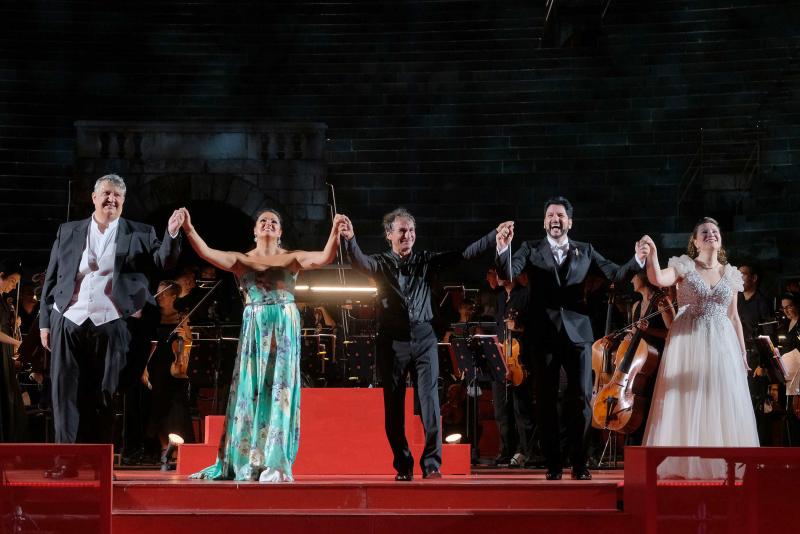 Cornice secondo noi perfetta, con il Maestro Marco Armiliato l’orchestra della Fondazione Arena ha mostrato una attenzione e precisione che hanno esaltato la compagine musicale. Intanto il feeling con gli interpreti era tale da non necessitare particolari attenzioni da parte del direttore e pur se alle sue spalle tempi, volumi e persino le sensazioni sono state sempre all’unisono. Due le sinfonie proposte tra le più amate ed eseguite di sempre, quella de I Vespri siciliani e del Don Pasquale. Due atmosfere completamente diverse ma stessa sensibilità, coesione nonostante le distanze tra i musicisti, molteplicità di colori e duttilità esecutiva. Se con I Vespri si fa intenso e coinvolgente, il suono diviene leggiadro e come sospeso nell’aria con la sinfonia del Don Pasquale.