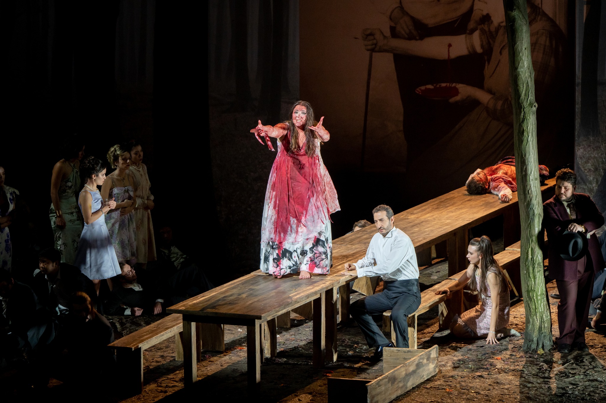 Questo il principale gancio da cui prende le mosse la regia di Jacopo Spirei, una chiara denuncia alla violenza sulle donne (in scena peraltro intorno alla data in cui ne ricorre la Giornata Internazionale dedicata). Il titolo si presta di fatto più di altri alla rappresentazione truce e purtroppo attuale di una società maschilista e cinica in cui l’impotente protagonista rimane schiacciata sublimandosi nella follia ed infine nella morte, facendosi drammaticamente portavoce di tutte le donne che tutt’oggi sono vittime di violenza, psicologica e fisica. Molto forti in questo senso le scene in apertura e chiusura dell’opera supportate da eccellenti attori/figuranti: nell’introduzione vediamo alcune donne indifese e terrorizzate che tentano di farsi forza tra loro, accerchiate da un branco di uomini che avanza con fare prima viscido, poi sempre più aggressivo e incombente; ritroveremo le stesse donne nel finale ultimo accasciate nel bosco, stuprate, uccise e abbandonate accanto ai resti di una carrozzeria smembrata e distrutta.
