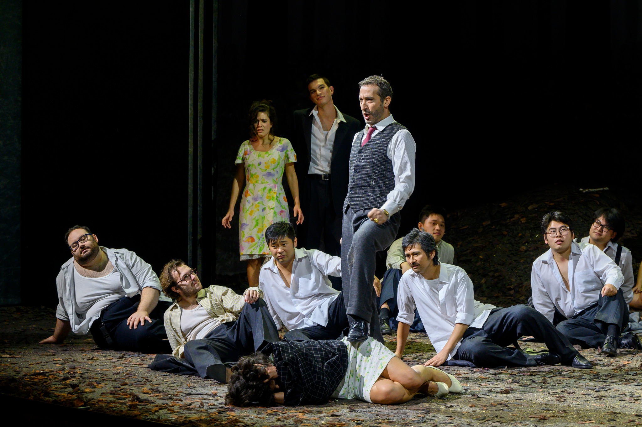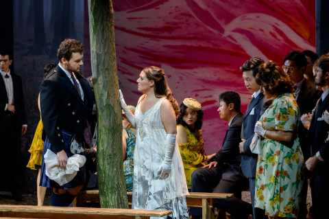 Non entusiasmano nemmeno le scene di Mauro Tinti che, nel ricreare con pannelli dipinti l’ambientazione di una cupa foresta in cui l’intera vicenda è immersa, non restituisce che il pallido riflesso della più celebre Traviata veneziana di Carsen. Nulla aggiungono nemmeno le immagini illustrative che di tanto in tanto appaiono sul fondo, da saturi dettagli di foglie autunnali a foto d’epoca in bianco e nero che non hanno né particolare impatto visivo né apparente correlazione l’una con l’altra, o con la scena rappresentata. Più funzionali i costumi contemporanei disegnati da Agnese Rabatti, che traslano efficacemente la vicenda al giorno d’oggi.
