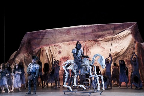 Con il suo Macbeth la regista Emma Dante firma uno degli spettacoli più particolari che abbiano affrontato il capolavoro shakespeariano, affrontando la storia del generale sanguinario con una regia molto concettuale, in cui anche ciò che di materiale esiste sul palco diventa fonte di tormento per i protagonisti. Centralità ai personaggi femminili che con le streghe e la terribile Lady monopolizzano gli eventi sì da lasciare tutti gli altri nell’ombra e non solo in senso figurato. Morte e vita sono continuamente contrapposti: morte a chiunque si ponga sul cammino di Macbeth impedendone l’ ascesa al dominio assoluto, morte rappresenta lo scheletro del suo stesso cavallo che cavalca nonchalante con la Lady; vita c’è invece nel grembo delle streghe, costantemente messe incinta dai satiri che le fanno partorire su un pentolone da cui poi pescano il frutto dei loro amplessi. Lunga vita al potere è ciò che si augura la fosca coppia, ma l’ombra dei misfatti sanguinari li perseguita ovunque col colore che lo rappresenta. Le mani colpevoli di Lady Macbeth sono screziate di rosso, il mantello del succube consorte è naturalmente rosso, come il lenzuolo che sembra perseguitarlo anche sul trono, e il colore dominante delle oscure luci di Cristian Zucaro è naturalmente il rosso.