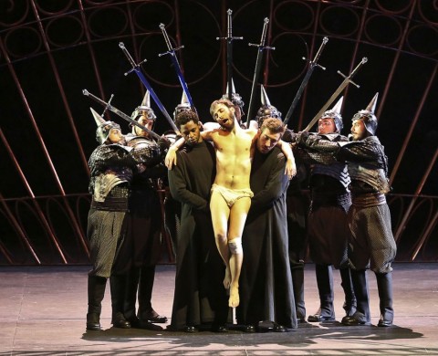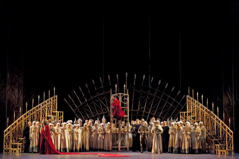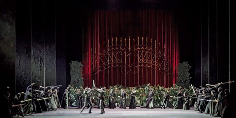 Sul palco Carmine Maringola crea pochi oggetti ma significativi: su tutti le enormi corone del potere che avvolgono ed opprimono al contempo i protagonisti, simbolo di potere e di orrore in questo caso. Il trono su cui siede Macbeth è altissimo ma anche precario, certo simbolo di aspirazione all’assoluto, ma anche di incertezza sul futuro. Straordinarie le danzatrici, streghe sinuosissime e quasi in preda a spasmi isterici nei movimenti coreografati da Manuela Lo Sicco, e perfettamente in simbiosi con l’elemento vocale del gruppo, il bravissimo coro femminile. Interessante la lettura del personaggio di re Duncano, qui visto come un Cristo immolato per la patria come fosse posto in croce dalle guardie di Macbeth. Bravissimo in questo caso il mimo Francesco Cusumano per gestualità ed espressività. Non mancano le licenze della regista, come far pronunciare direttamente a Macbeth le parole della profezia rivolgendosi alla consorte all’inizio, o trasformare la foresta di Birnam in un bosco di fichi d’india siciliani, che qui simboleggiano il pericolo e non certo la rigogliosità delle nostre terre. Lady Macbeth infine muore di insonnia, circondata da letti che la inseguono per tutto il palco, scomparendo dalla scena sfinita e quasi senza voce. I costumi di Vanessa Sannino si adattano perfettamente a questa atmosfera cupa e misteriosa, talvolta selvaggia, della messa in scena. Dispiace solo il taglio dei ballabili, forse ritenuti superflui in questo allestimento.