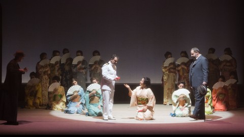 Il nuovo allestimento della fondazione triestina quindi convince pienamente, anche grazie agli appropriati costumi di Sara Marcucci e all’eleganza e semplicità delle scene di Emanuele Genuizzi e Stefano Zullo. Gli spazi piuttosto cupi stanno a simboleggiare un mondo interiore - in cui domina un’atmosfera rarefatta e onirica valorizzata dalle belle luci di Stefano Capra – ed evocano le classiche case giapponesi grazie alla presenza di pochi elementi e pannelli scorrevoli decorati, che si rifanno alle locandine pucciniane di Leopoldo Metlicovitz. Assolutamente suggestivo l'utilizzo di lanterne sospese durante il duetto d’amore fra Cio Cio San e Pinkerton e delle foglie d’acero del giardino che ricreano le stelle della bandiera americana presente sulla cannoniera al suo ingresso nel porto.