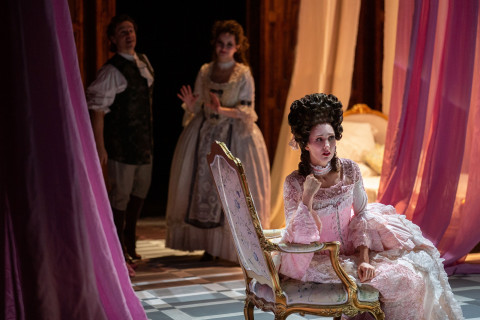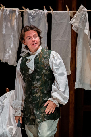 Vero e proprio factotum della produzione è Ivan Stefanutti che firma regia, scene e i bellissimi costumi d’epoca, magistralmente realizzati dal veneziano Nicolao Atelier. Stefanutti immagina un palazzo che vuole essere un labirinto della mente fatto di eleganti porte, finestre e armadi in legno che spiccano sul nero delle quinte su cui poggiano e che risultano quasi comporre una prigione virtuale da cui i personaggi non possono fuggire fino al dipanarsi delle vicende. Un allestimento basic e tradizionale, rassicurantemente fedele al libretto ma non per questo didascalico nel senso negativo del termine: anzi lo svolgersi dell’azione è vivacissimo e mai banale, in particolar modo nel primo atto e le buone idee qua e là non mancano.