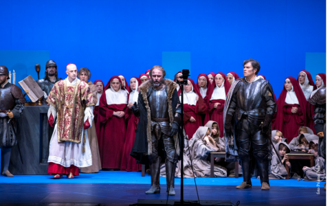 I protagonisti dunque, sebbene dotati di voci interessanti ed in alcuni casi ben note, hanno forse sofferto un po’ di questa soluzione registica, anche per lo sforzo richiesto dal punto di vista vocale come detto. La trama è abbastanza lineare: in estrema sintesi siamo nella Toscana ai tempi dei Medici, con il castello di Montelabro assediato dalle Bande Nere dei senesi, il cui capo è appunto Palla de’Mozzi. Neanche a dirlo suo figlio si invaghisce della bella erede dei Montelabro, lascia fuggire il nemico assediato e di conseguenza rischia la condanna a morte da parte del padre, che, bloccato dai suoi stessi soldati è costretto a togliersi la vita per salvare l’onore. Angelo Veccia è un Palla de’ Mozzi caricato di una moralità esagerata, che sconfina nell’esaltazione finché non viene fermato dai suoi stessi ufficiali. A tal ruolo è asservita una voce brunita e possente che necessariamente si gonfia di impeto e disperazione man mano che lo spettacolo avanza; il figlio Signorello non spicca per scioltezza scenica, certo per i motivi di cui sopra, ma anche dal punto di vista vocale il bel timbro di Lorenzo Decaro sembra trattenuto per qualche motivo, pur riconoscendone un velluto particolare che ci piacerebbe risentire in altri ruoli; il duo dei Montelabro è costituito da Andrea Vincenzo Bonsignore, austero e molto concentrato sulla parte, anch’egli dal timbro scuro e tortuoso che si adatta al ruolo, e dalla bella Anna Bianca, una Astrik Khanamiryan che poteva forse dare di più al personaggio, con voce impetuosa che si avvale di acuti sicuri e volumetrici, ma priva della marcata sensualità che il ruolo le impone, anche nelle scene di più ardita seduzione. Molto bene tutti i personaggi che ruotano intorno a quelli principali: il Vescovo di Luca Dall’Amico, che abbiamo sempre apprezzato per il timbro di autentico basso, quale è anche il bravo Cristian Saitta come Niccolò; molto bene anche in scena sono Giomo, ossia Murat Can Güvem, lo Spadaccia di Matteo Loi, Il Mancino di Andrea Galli e lo Straccaguerra di Giuseppe Raimondo. Chiudono il cast il capo dei Lanzi, unico a volere la pelle di Signorello, alias Alessandro Busi¸e le brave suore Elena Schirru e Lara Rotili.