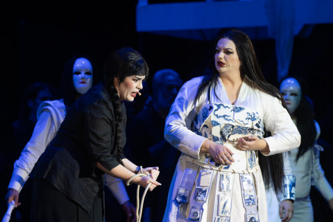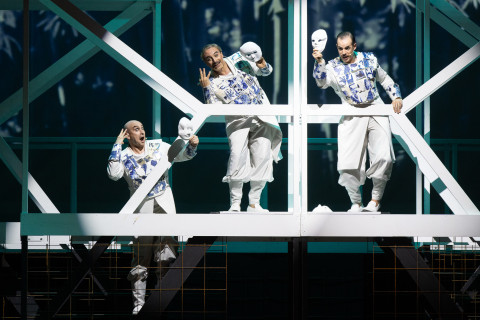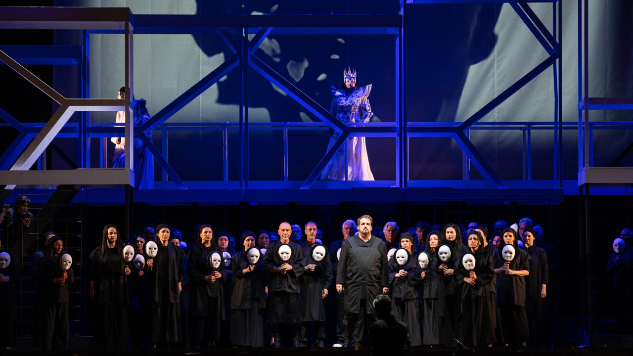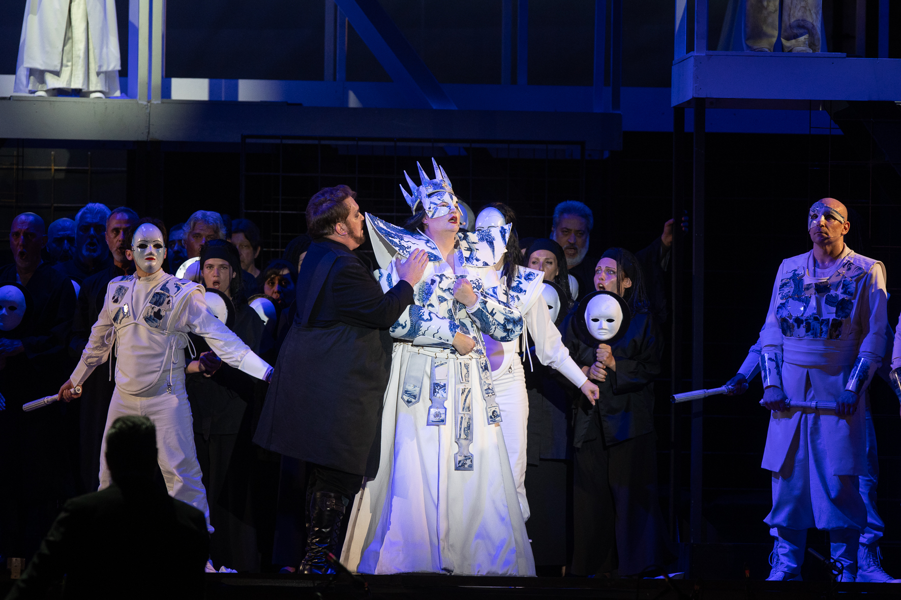 L’impianto scenico è quello ideato da Paolo Vitale nel 2019, poi già declinato nel 2023 secondo la regia di Davide Garattini Raimondi che ricrea un mondo diviso in due, bianco e nero (come i costumi di Danilo Coppola), violento, in cui l’amore tenta di sopravvivere e alla fine vince sul potere e sull’odio, che si sgretolano come la corazza di ceramiche bianche e azzurre che la protagonista ha creato attorno al suo cuore.