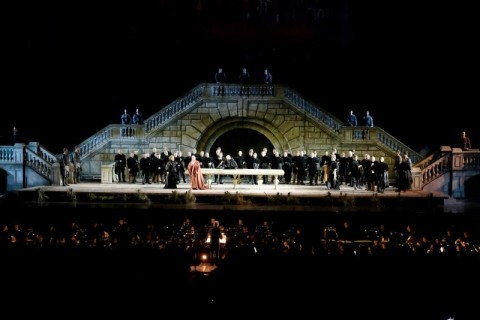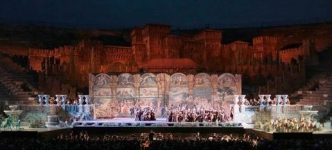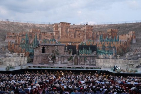 Torna con discreta frequenza il suggestivo spettacolo che fu ideato da Ivo Guerra per Rigoletto di Verdi all’Arena di Verona, con le imponenti scene pittoriche di Raffaele Del Savio ed i costumi cinquecenteschi di Carla Galleri. Una delizia per chi voglia immergersi completamente nelle vicende, facilmente fruibili grazie alla cura nei dettagli, alla riproduzione della Mantova cinquecentesca sullo sfondo, agli ambienti finemente riprodotti, come l’elegante cortile del palazzo ducale, l’esterno della casa di Rigoletto, la casa di Sparafucile lungo il fiume, ecc. Uno spettacolo che lascia comunque spazio agli interpreti, liberi di andare su e giù per le scale o avanti e indietro tra fontane con tritoni danzanti, cespugli, colonne, vasellame e tanto altro presente in scena. Molto d’effetto anche le luci che seguono le atmosfere misteriose, languide o tragiche degli eventi, riproducendo anche la tempesta di fulmini che avvolge la cupa notte della maledizione compiuta.