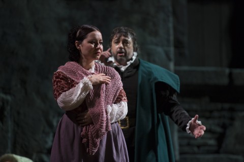 Ci troviamo infatti immersi nella magnifica Mantova del Cinquecento con i suoi palazzi, le sue corti e perché no, il suo mistero. La struttura girevole curata da Alessandro Ciammarughi ci porta nel palazzo del Duca di Mantova, nella casa di Rigoletto o nella locanda di Sparafucile con particolari curati al dettaglio così da supportare gli interpreti in ogni scena; le luci di Fabio Rossi con i suoi chiaroscuri o lampi naturalistici esaltano ed intensificano l’atmosfera generalmente cupa che impera sui destini dei personaggi; i bei costumi cinquecenteschi dello stesso Ciammarughi completano la ricchezza di questo spettacolo che onora ed esalta il libretto.
