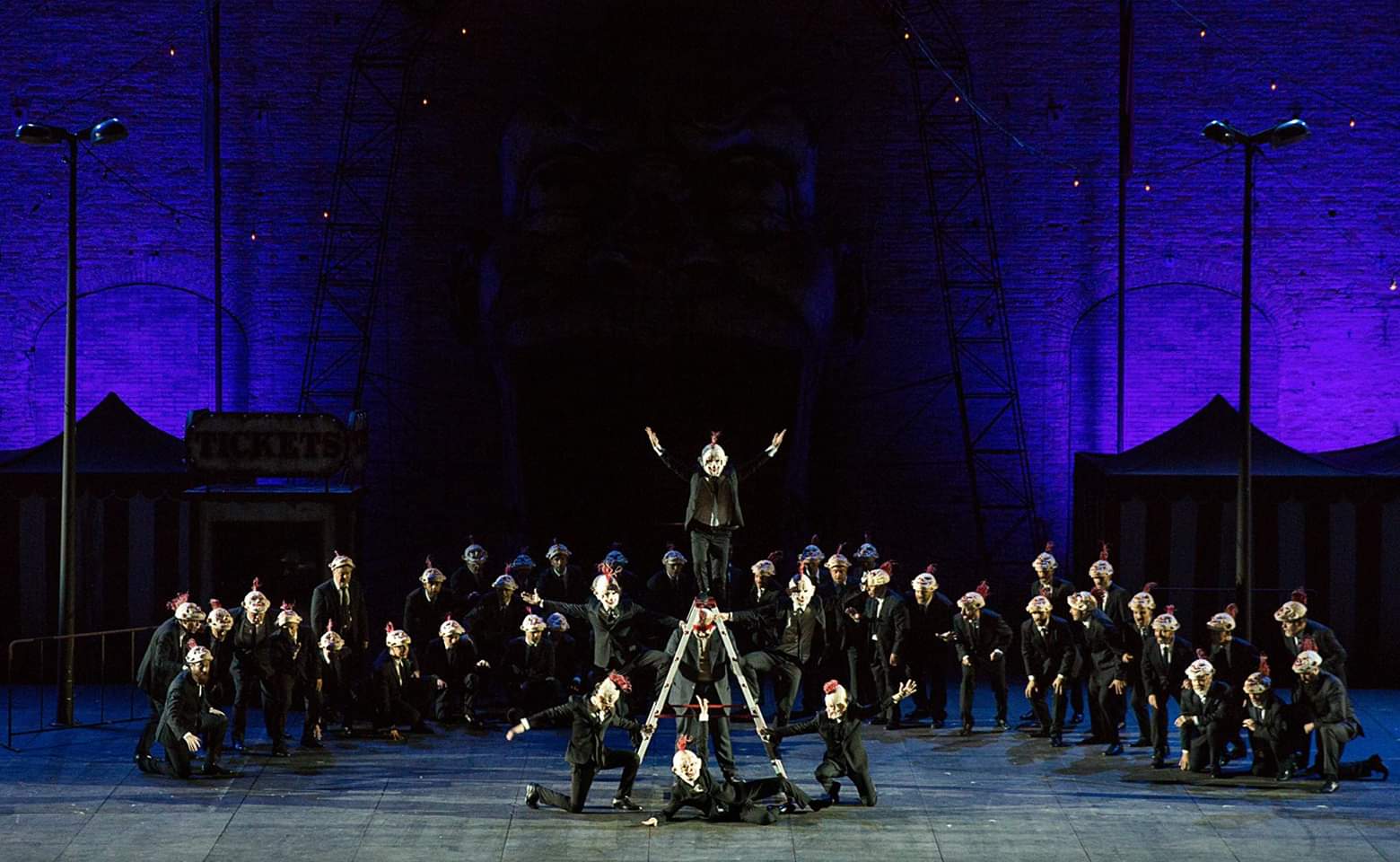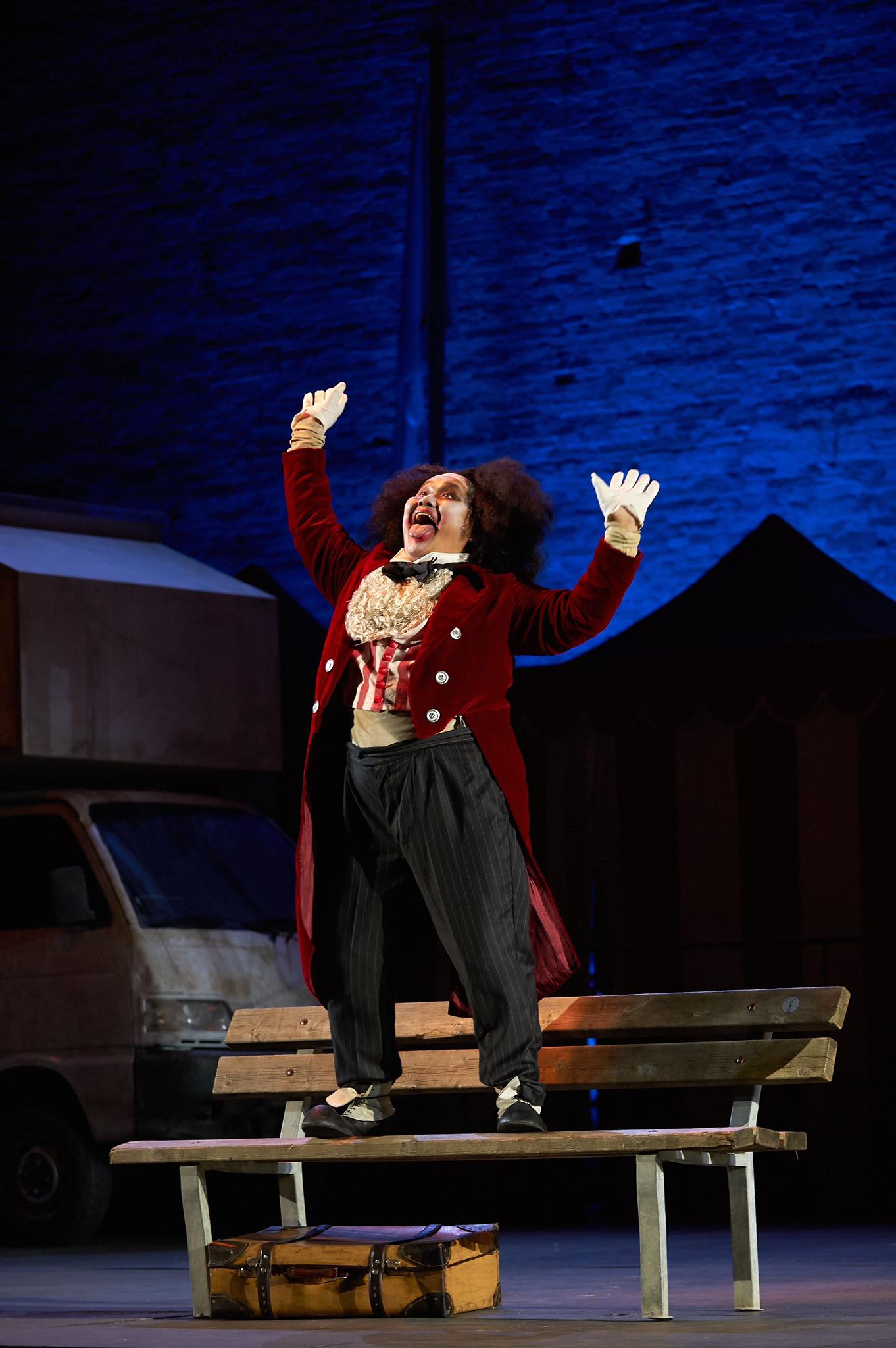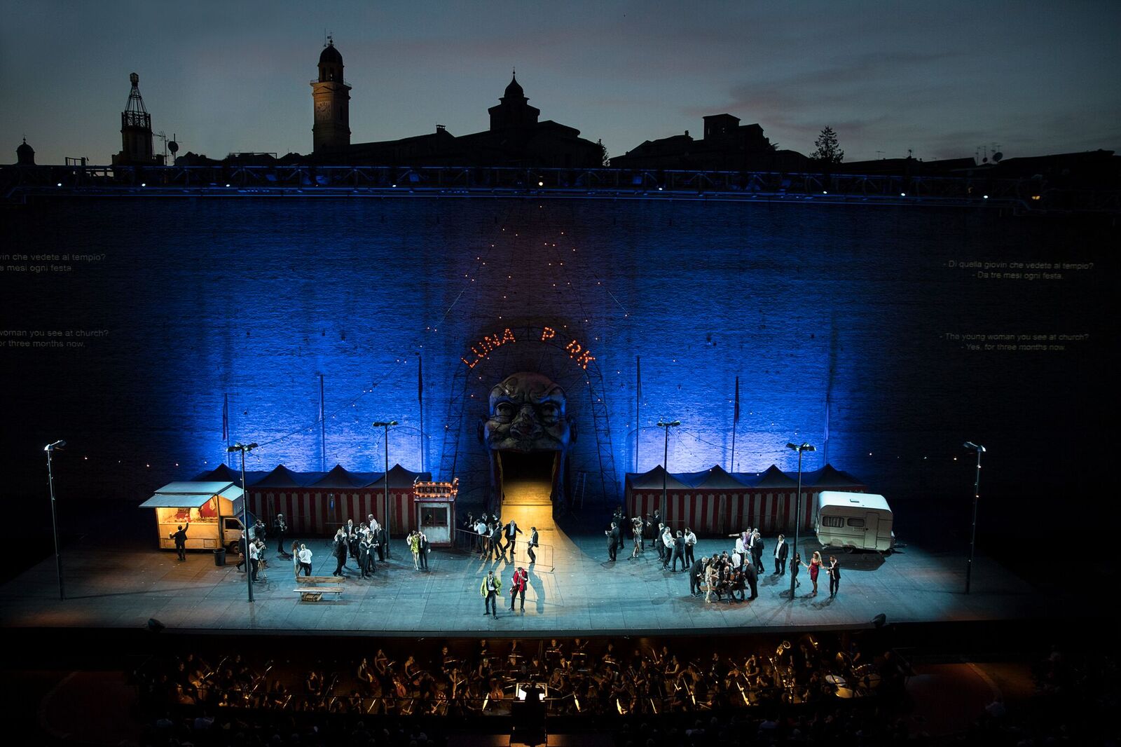 In quanti e quali modi si sia trattato il difficile mondo del tragico gobbo deriso, la sua storia resta il simbolo di chi dalla condizione di incompreso e sbeffeggiato, passi amaramente dalla parte del torto e con le sofferenze più atroci. Il mondo di Rigoletto è lo stesso ovunque lo si voglia raccontare, perché tiranni vi furono in passato quanti ne esistono a iosa nel presente, così come tanti sono i disperati che si compromettono e si corrompono per la troppa sofferenza. In un turbinio di colpe ed accuse, la vita diventa una giostra su cui possono salire solo i più scaltri senza esserne scaraventati giù e malamente feriti. Così deve aver immaginato il regista Federico Grazzini il contesto del Rigoletto che debuttò nel 2015 e riproposto quest'anno allo Sferisterio di Macerata, riuscendo a trasporre il suo dramma dalla corte di Mantova del Sedicesimo secolo ad uno scalcagnato e maltenuto luna-park odierno, disegnato da Andrea Belli, popolato ormai solo da bande di malviventi di cui Rigoletto stesso è un membro. Unica sua gioia è la meravigliosa e pura figliola, nascosta da tanto lordume. Il regista ha pensato ad una ambientazione fosca e malavitosa costituita da una massa di sbandati tra cui l'ambulante Sparafucile col suo sudicio chiosco, sua sorella che frequenta solo prostitute, e Rigoletto appunto, confinato in una roulotte con Gilda. A completare il quadro sono le numerose comparse/mimi che compongono le bande di malavitosi, spesso impegnati in coreografie un po' grottesche ma che alleggeriscono di non poco la tensione. Come a conclusione di un delirio generale in cui è coinvolta la sua esistenza, Rigoletto, che per la verità sembra più in preda ai sintomi di una forte sciatica piuttosto che affetto da deformità, si accomiata dallo spirito della figliola ormai deceduta percependone l'immagine fisica, perché come sappiamo bene l'amore continua oltre la materia terrena. Di sicuro impatto sono le luci rielaborate da Ludovico Gobbi che ottiene per ogni situazione la giusta sfumatura andando a colpire lo sguardo di chi osserva con i suoi colori accesi. I costumi adeguati al contesto sono di Valeria Donata Bettella.