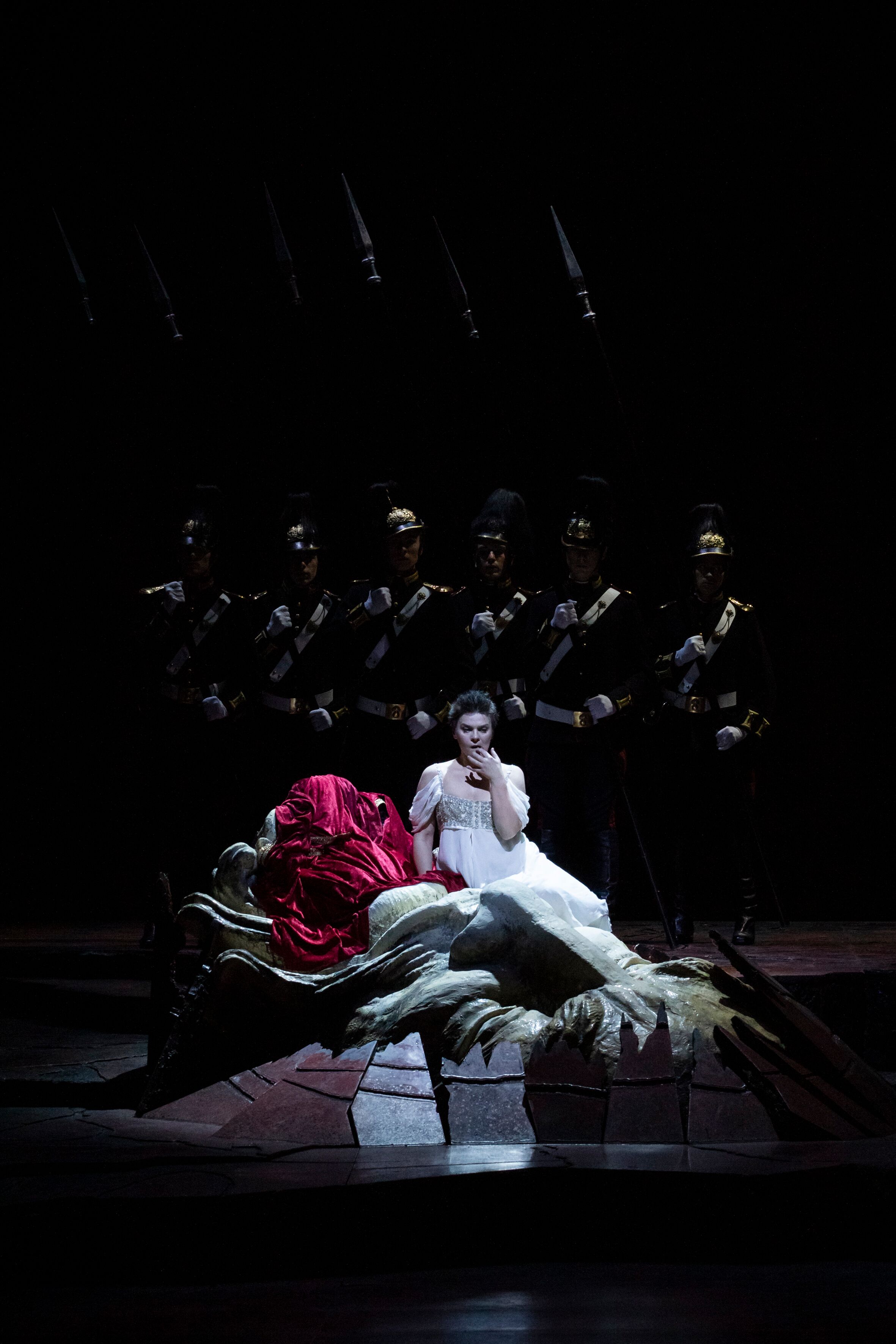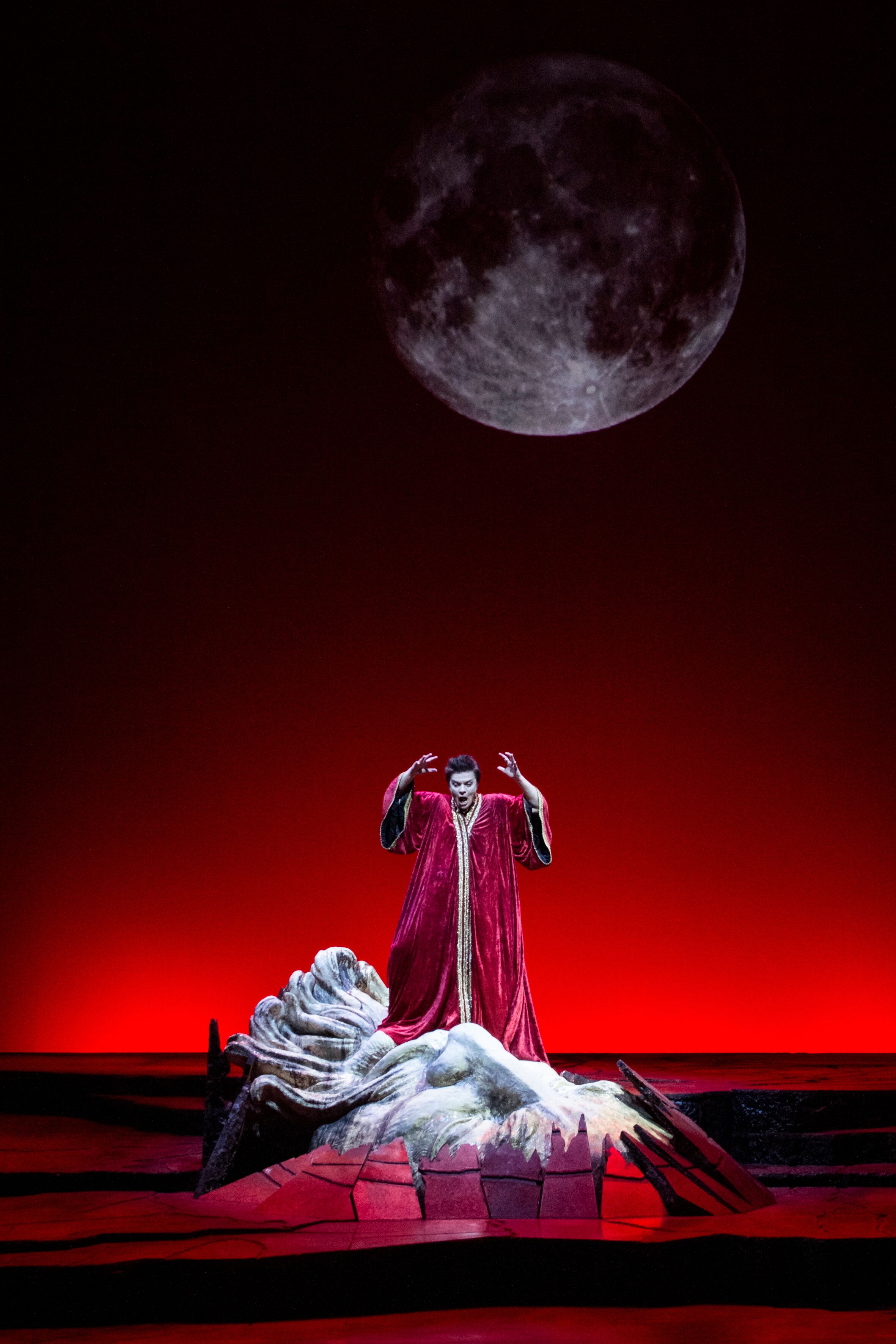 Lavia ambientava il tutto all’epoca di Strauss e dunque Erode ricorda vagamente Guglielmo II di Prussia con tutta la corte al seguito vestita di conseguenza da Andrea Viotti. Ma il libretto è rispettato, la storia segue il suo filo conduttore in una atmosfera quasi sospesa, con i toni accesi delle luci prevalentemente rosso sangue di Daniele Naldi. Ma non vi sono esagerazioni o gusto per l’orrido o lo spinto. La danza si basa prevalentemente su piccole provocazioni e la testa di Giovanni è una enorme riproduzione che spunta dalla terra su cui Salome termina i suoi tormenti giustiziata dalle guardie.