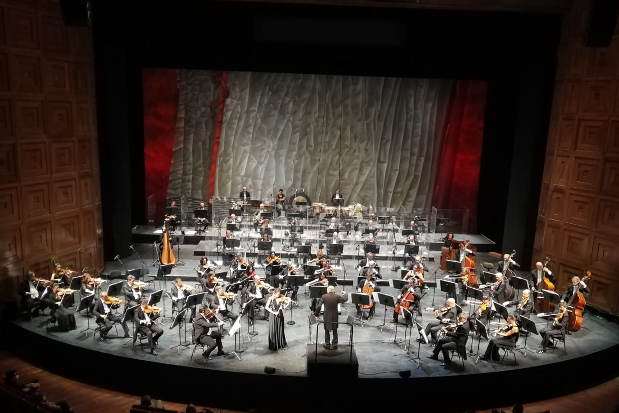 Come previsto dalle norme vigenti, in sala accesso per un massimo di 200 persone, mascherine per tutta la durata del concerto e sul palco protezioni in plexiglass per legni e ottoni. Ma la sensazione è quella di una grande serata di musica, con l'Orchestra in frac come non si vedeva da tempo.